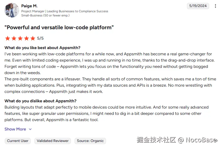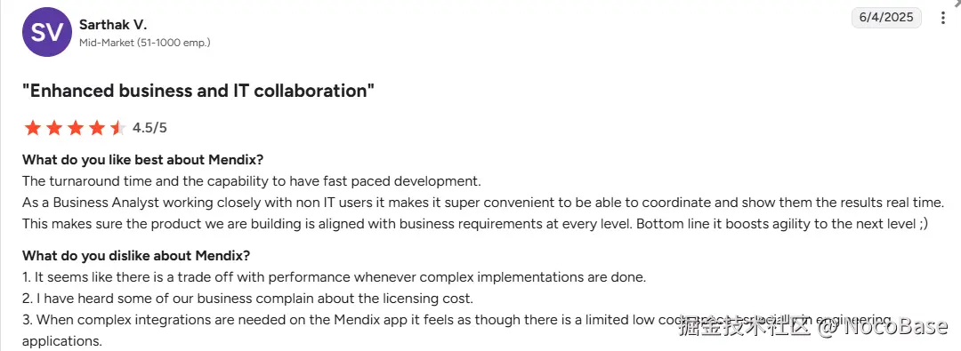 - 用户评价 :G2 里有开发者表示权限模型完善开发效率高、能快速响应业务需求,但是复杂实现会拖慢性能、授权费用偏高,而在做复杂系统集成时"低代码空间"显得受限。