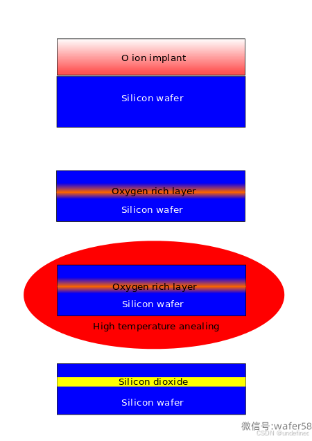 高能氧离子被注入到硅衬底中的一个特定深度。通过控制氧离子的能量和剂量,能够确定将来的二氧化硅层的深度和厚度。注入氧离子的硅片经历一个高温退火过程,通常在1100°C到1300°C之间。在这个高温下,注入的氧离子与硅反应,形成一个连续的二氧化硅层。这个绝缘层被埋在硅衬底下面,形成了一个SOI结构。表面的硅层成为制造芯片的功能层,而下面的二氧化硅层作为绝缘体层,将功能层与硅衬底隔离。