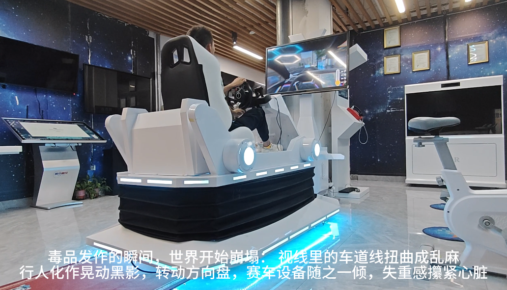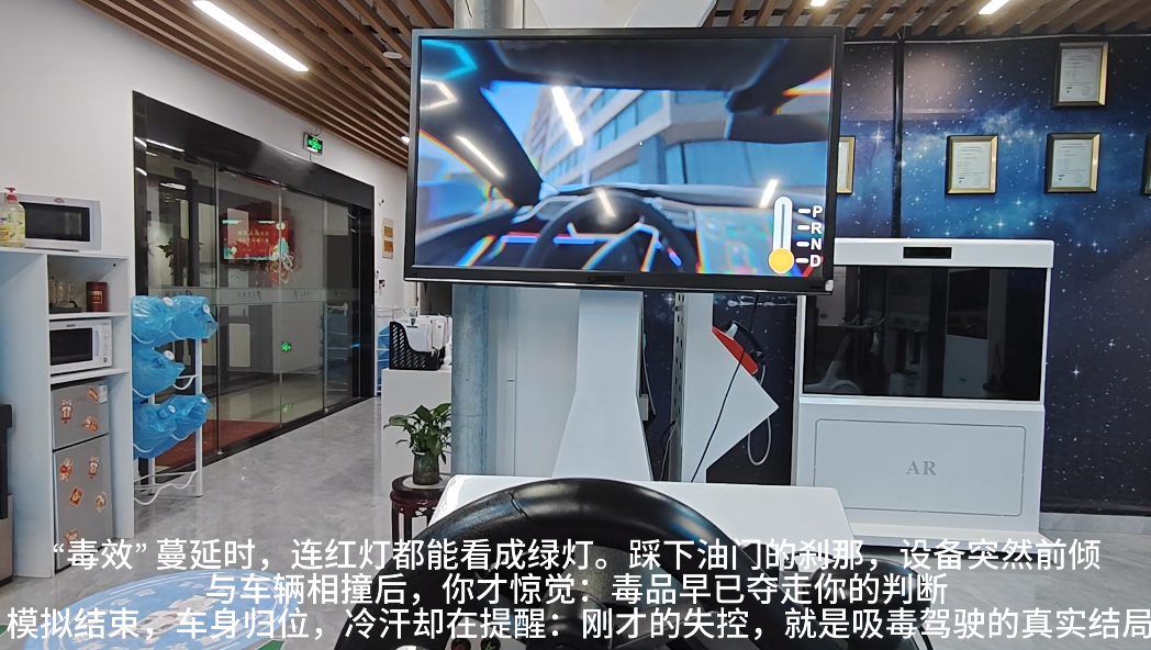 随着体验推进,场景画面出现明显扭曲,路边行人、信号灯忽明忽暗,甚至出现"前方无障碍物却看到墙体"的幻觉,同时模拟驾驶舱座椅开始不规则振动,模拟 "身体不受控制的颤抖",体验者会发现即使紧盯前方,也难以保持车辆在车道内行驶,稍不注意就会触发 "撞向隔离带""闯红灯"等虚拟事故,事故发生时,VR 画面会瞬间切换至"事故后车辆损毁、医护人员救援"的场景,并同步播放真实毒驾事故的音效,带来强烈的视觉与听觉冲击。