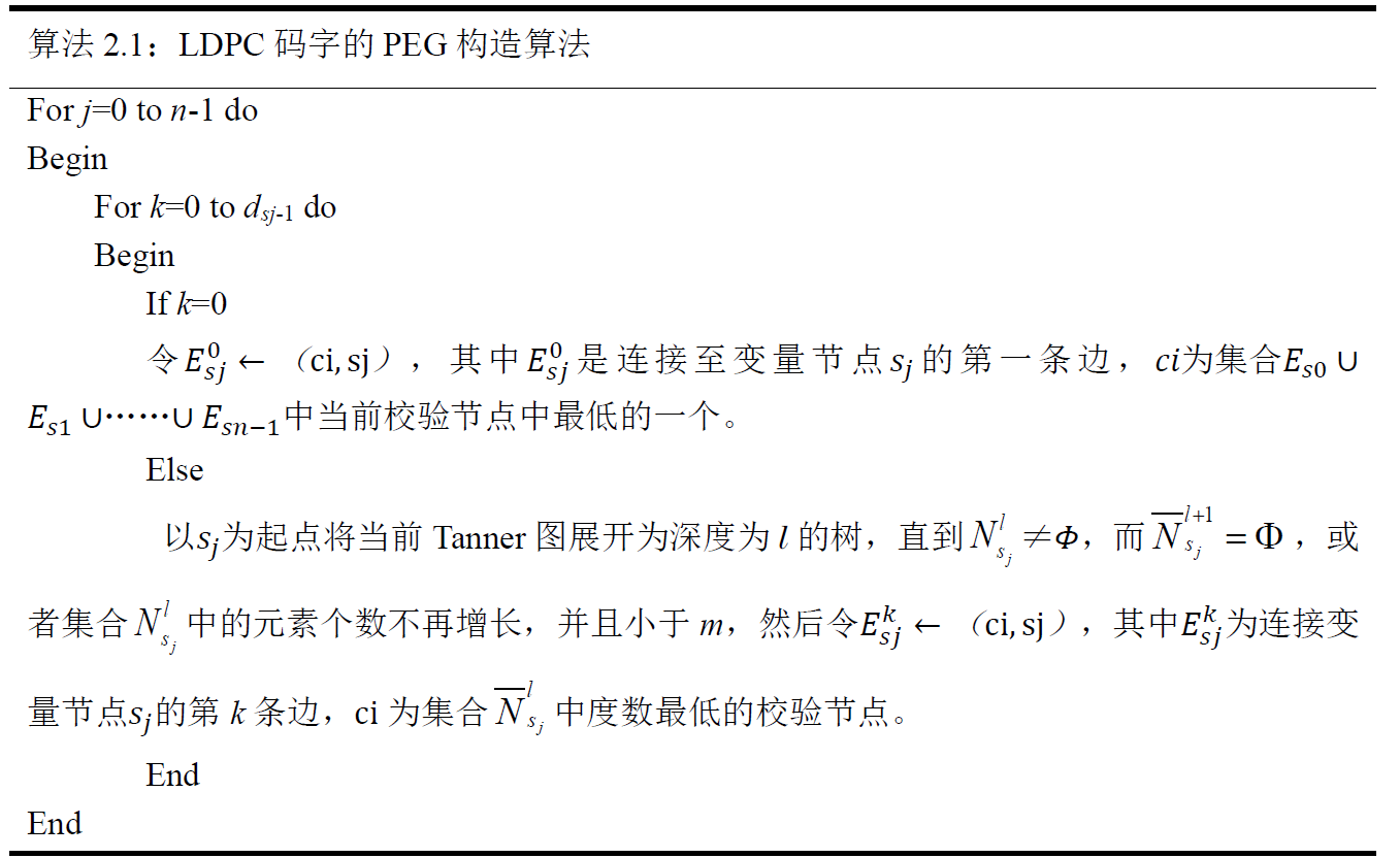 Xiaoyu Hu 等人提出了一种渐进边增长的算法,它是一种贪心算法,在需要校验矩阵的围长较大时,PEG算法的优势明显,PEG 算法是按照逐条边添加的方法构造Tanner图的,在每一条边添加时,尽量保证局部围长最大。