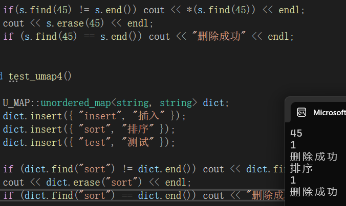 if (dict.find("sort") == dict.end()) cout << "删除成功" << endl;