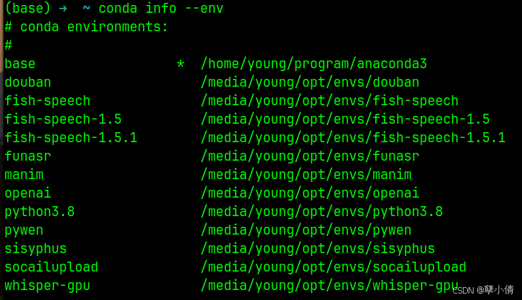 遗憾的是,Conda 本身并不提供查看环境体积的命令,但其实每个环境就是一个目录,你可以直接用 du 命令统计。