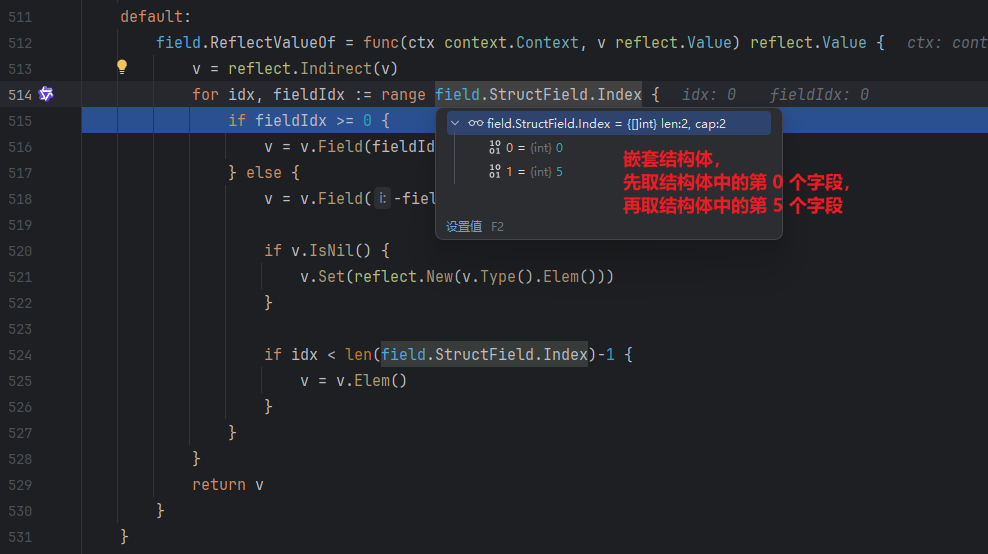 - 也就是说,需要通过反射,找到结构体里面的 [0, 5] 字段,给他赋值。