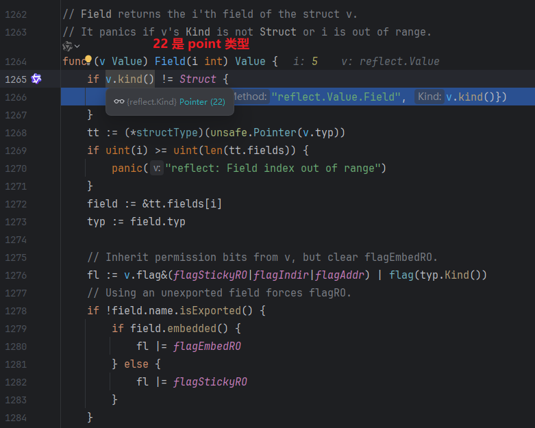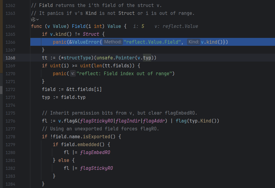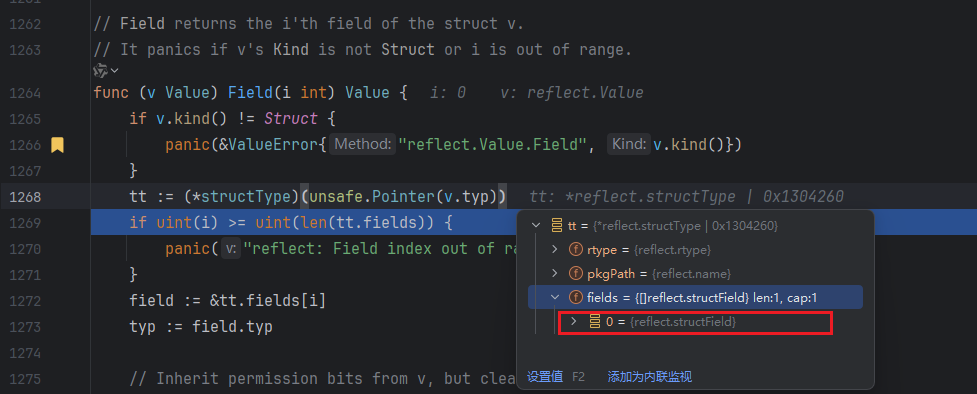 但是这里的 v 是 dest 反射值的解引用,实际上是一个不完整的结构,能看到里面只有一个字段。
