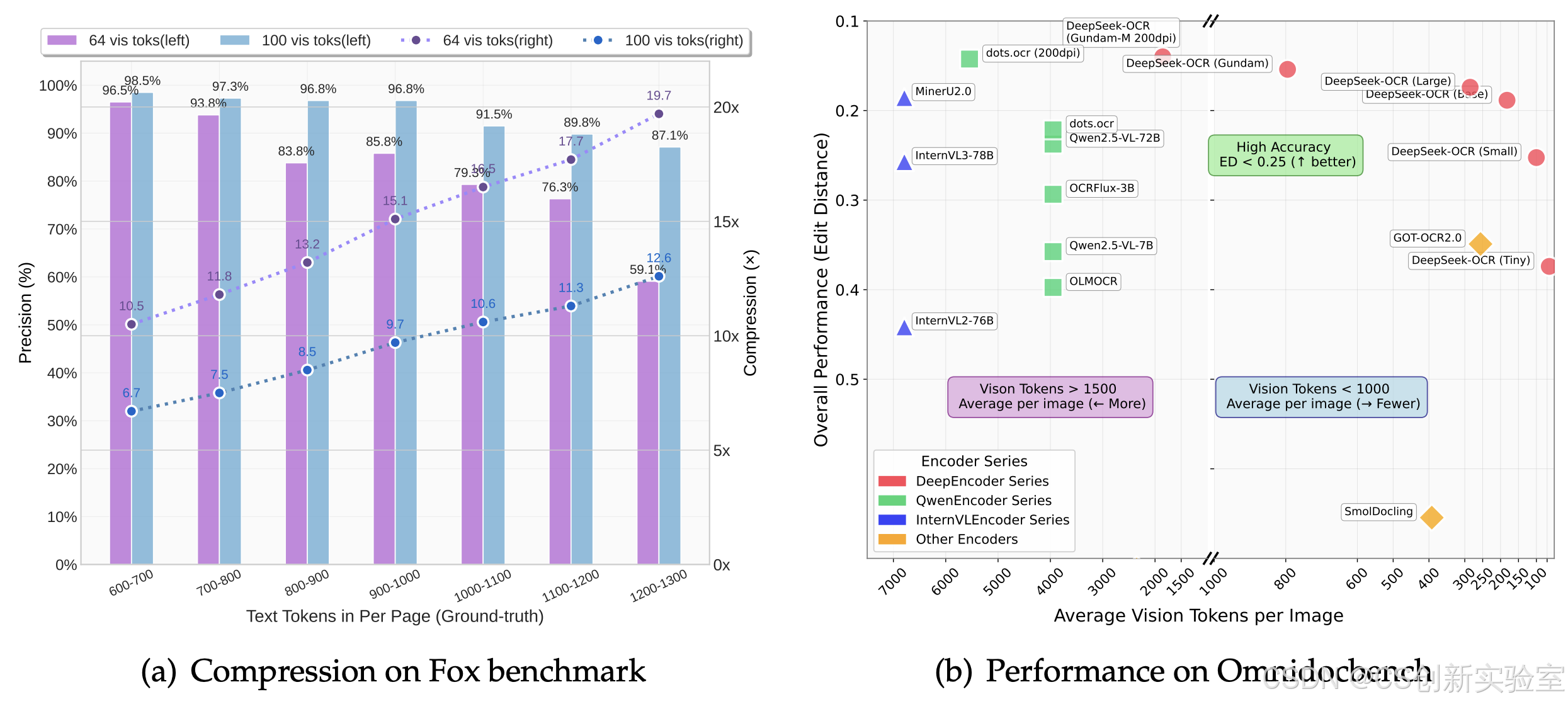 图1 | (a)图显示在Fox [21]基准测试中的压缩比(真实文本令牌数/模型所用视觉令牌数);(b)图展示在OmniDocBench [27]上的性能对比。DeepSeek-OCR能够在端到端模型中实现最少的视觉令牌使用量,同时达到领先性能水平。
