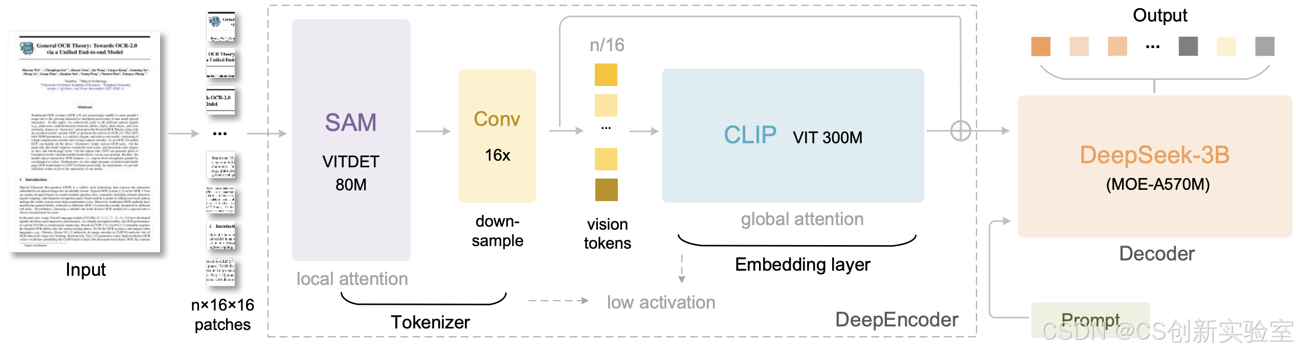 图3 | DeepSeek-OCR架构示意图。DeepSeek-OCR由DeepEncoder编码器与DeepSeek-3B-MoE解码器构成。其中DeepEncoder作为系统核心,包含三个组件:基于窗口注意力机制的SAM[17]感知模块、采用密集全局注意力的CLIP[29]知识模块,以及连接二者的16倍标记压缩器。