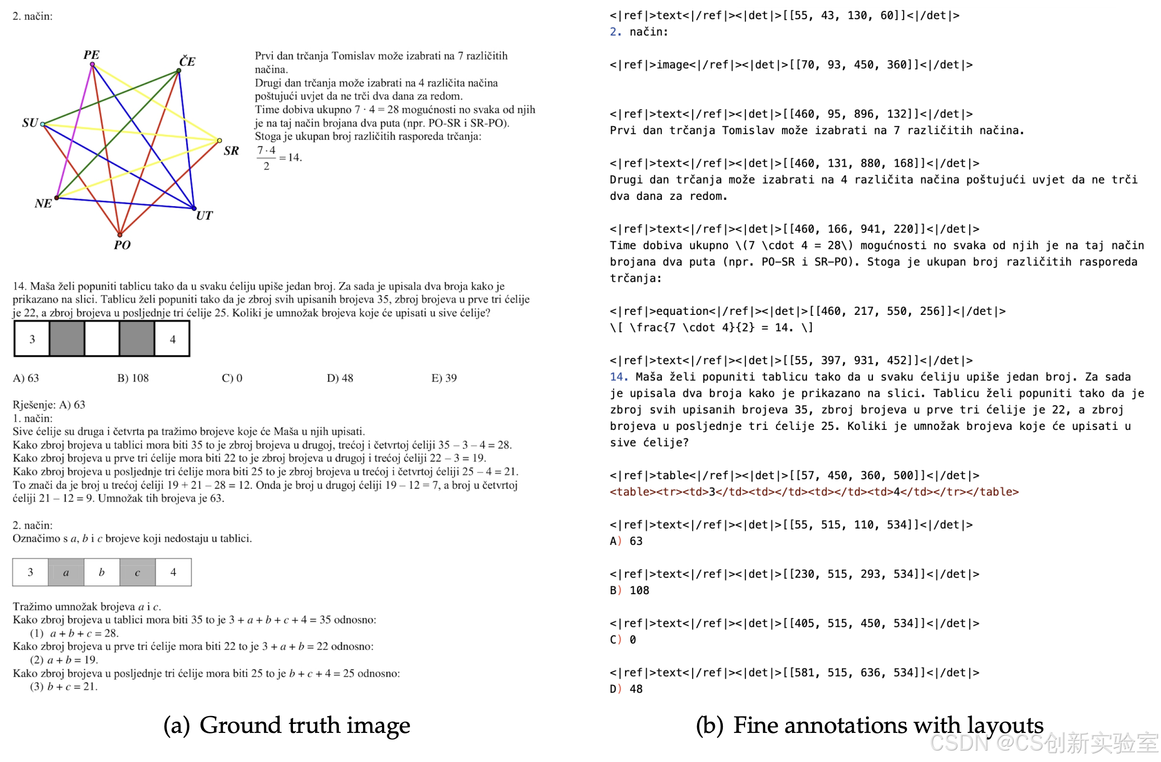 对于小语种数据,在检测环节我们发现版面分析模型具备一定泛化能力;在识别环节,通过fitz创建小图块数据训练GOT-OCR2.0模型,继而使用训练后的模型对版面处理后的小图块进行标注,借助模型飞轮机制生成60万数据样本。在DeepSeek-OCR训练过程中,通过不同提示词区分粗/细粒度标签。细粒度图文对真值标注示例如图5所示。
