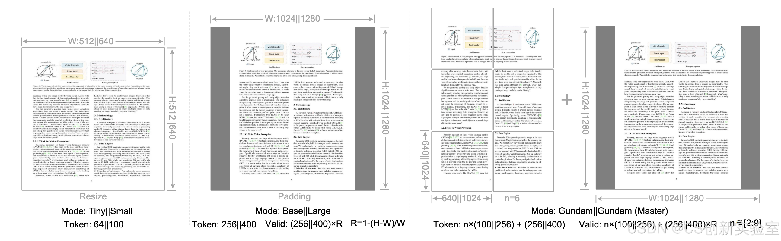 原生分辨率支持四种子模式:Tiny、Small、Base和Large,其对应分辨率与标记数分别为512×512(64)、640×640(100)、1024×1024(256)和1280×1280(400)。由于Tiny和Small模式分辨率较小,为避免视觉标记浪费,采用直接缩放原图尺寸的方式处理。对于Base和Large模式,为保持原始图像宽高比,会对图像进行填充至对应尺寸。填充后有效视觉标记数将少于实际视觉标记数,计算公式如下:
