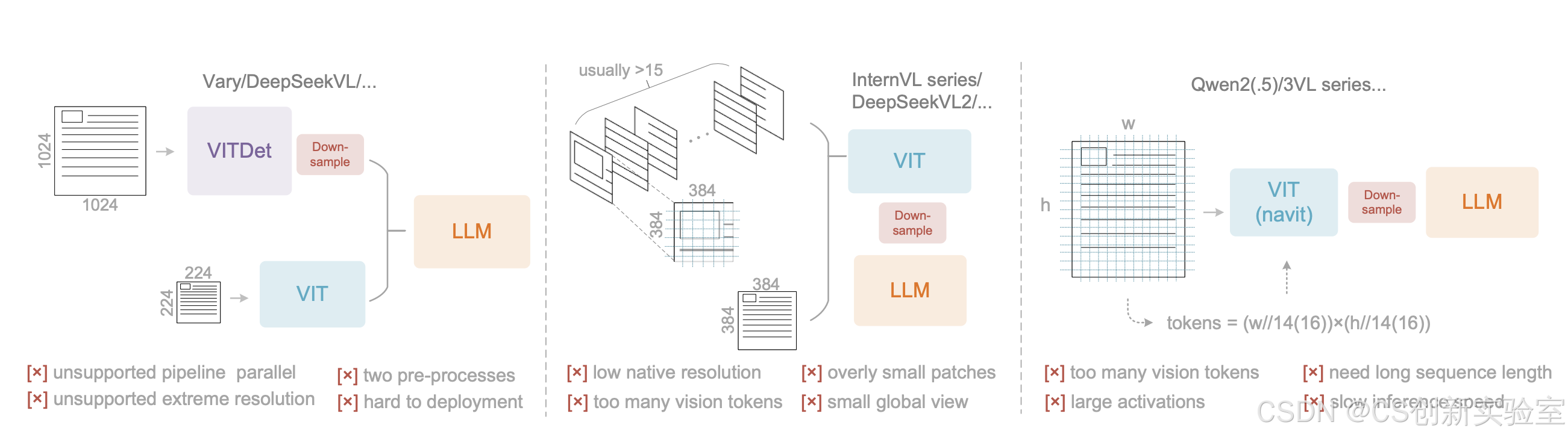如图2所示,当前开源VLM主要采用三类视觉编码器架构:第一类是以Vary[36]为代表的双塔架构,通过并行SAM[17]编码器扩展视觉词表参数以处理高分辨率图像。该方法虽能控制参数量和激活内存,但存在明显缺陷:需要双重图像预处理导致部署复杂化,且训练时难以实现编码器流水线并行。第二类是以InternVL2.0[8]为代表的分块处理方法,将图像分割为小块进行并行计算以降低高分辨率下的激活内存。尽管能处理极高分辨率,但由于其基础编码器分辨率通常较低(低于512×512),导致大尺寸图像过度碎片化并产生大量视觉令牌。第三类是以Qwen2-VL[35]为代表的自适应分辨率编码,采用NaViT[10]范式直接通过基于图像块的分割处理完整图像而无需分块并行。该编码器虽能灵活适应不同分辨率,但处理大图像时面临严峻挑战:巨大的激活内存消耗可能导致GPU内存溢出,且训练时序列打包需要极长序列长度。过长的视觉令牌会同时拖慢推理过程的预填充和生成阶段。