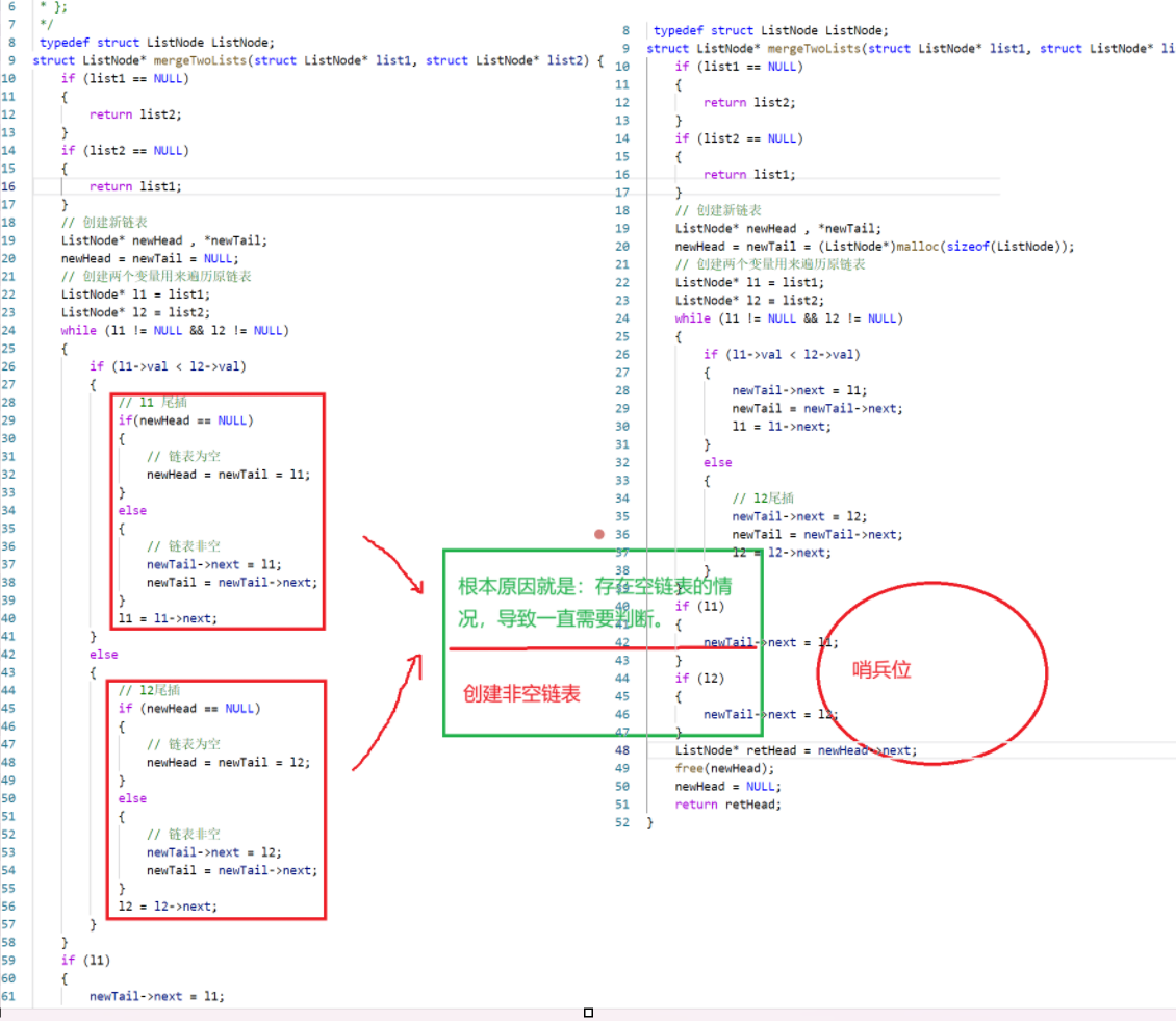 对比可以看出,代码量缩短了,其中使用到了哨兵位,就是不储存数据,只是占一个位置。