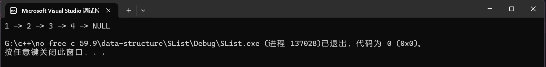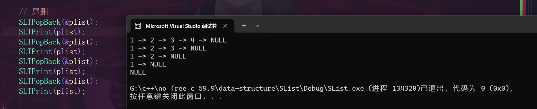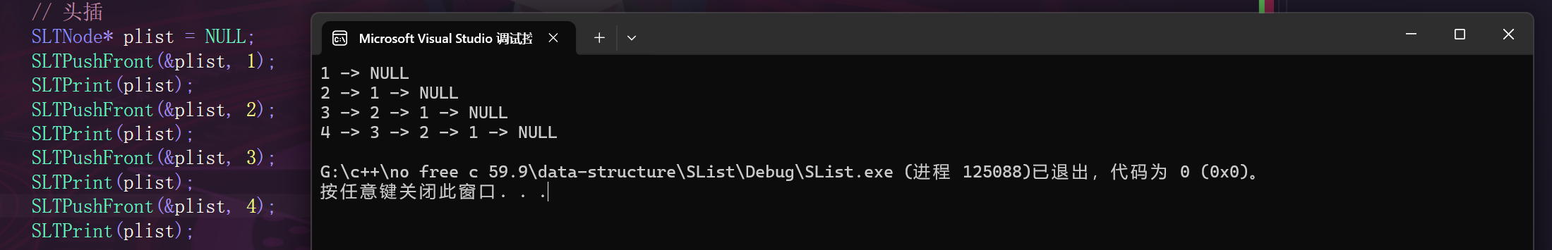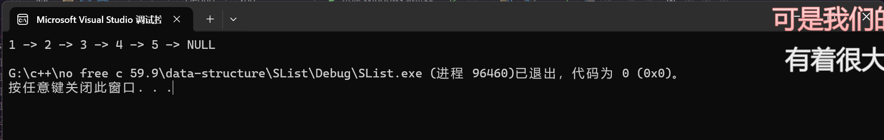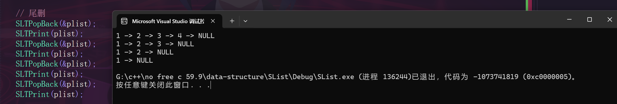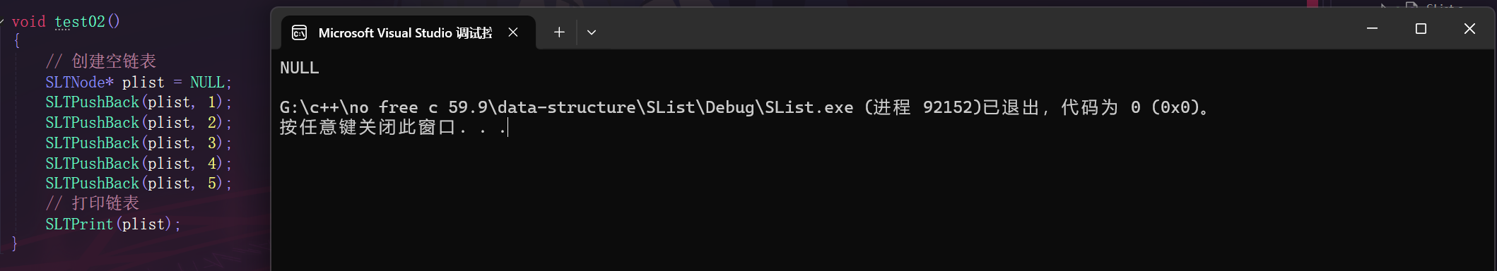 从逻辑上我们写出了尾插的代码,但是会不会有问题呢?这段代码看起来是没有问题的。我们要养成良好的习惯,在写完一段代码后进行测试,我们来测试一下: