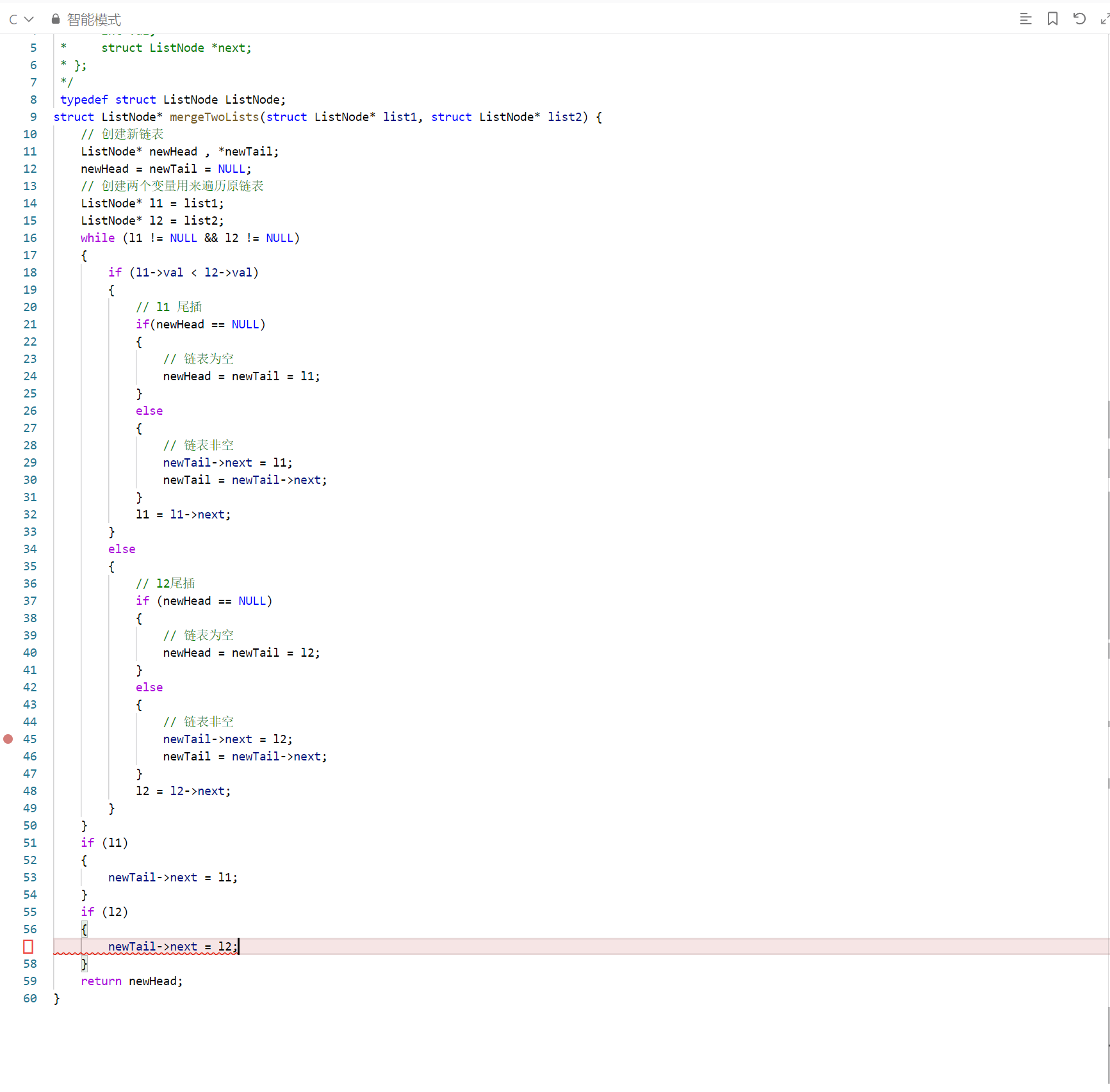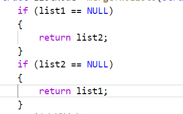 也就是俩者都为空的时候,会发生解引用错误,我们应该特殊处理一下,在开头我们判断list1和list2是否为空。