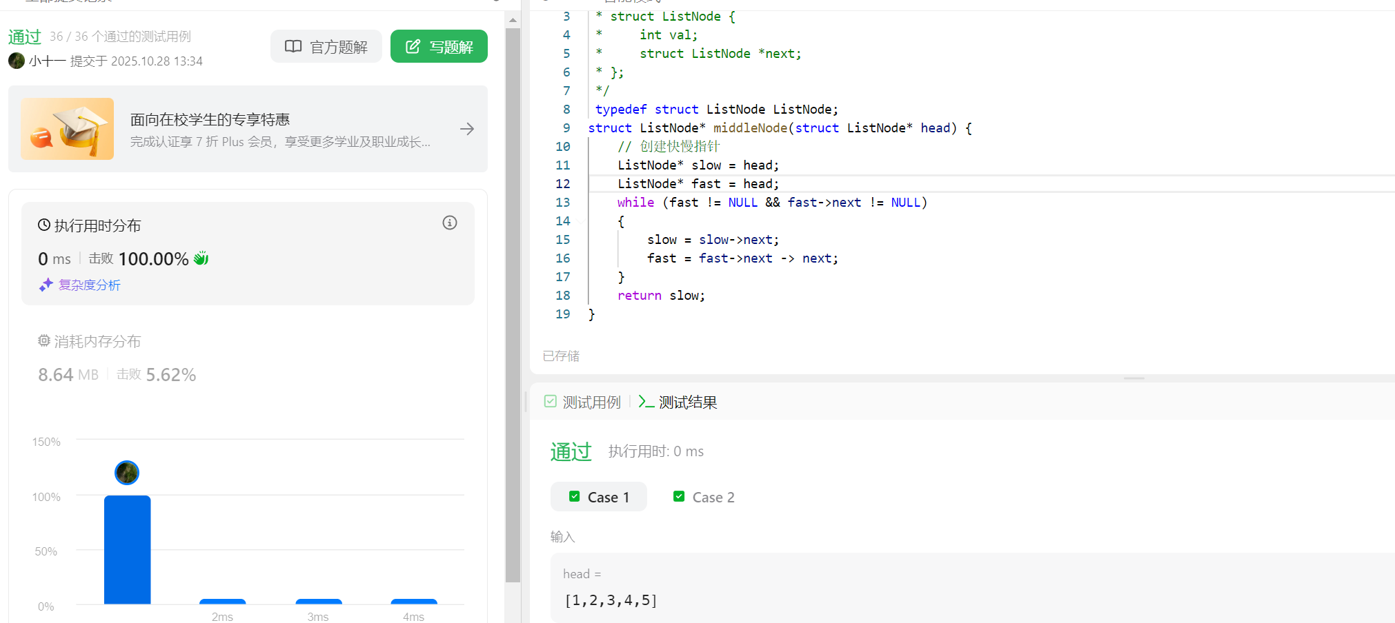 我们在题库中写完代码并测试且通过了。有了思路写代码就是非常快的。所以我们在以后遇到算法题的时候,一定要先整理思路,然后开始写代码。这样准确率和速度的提升都是非常巨大的。