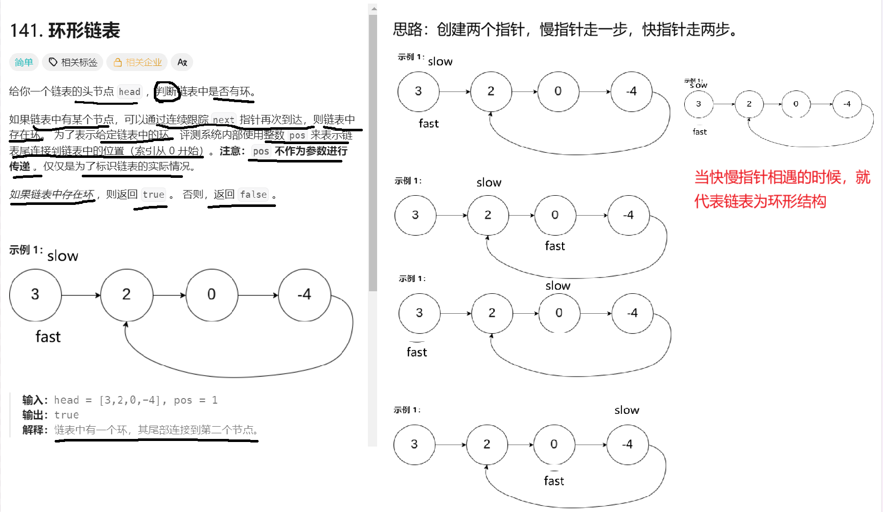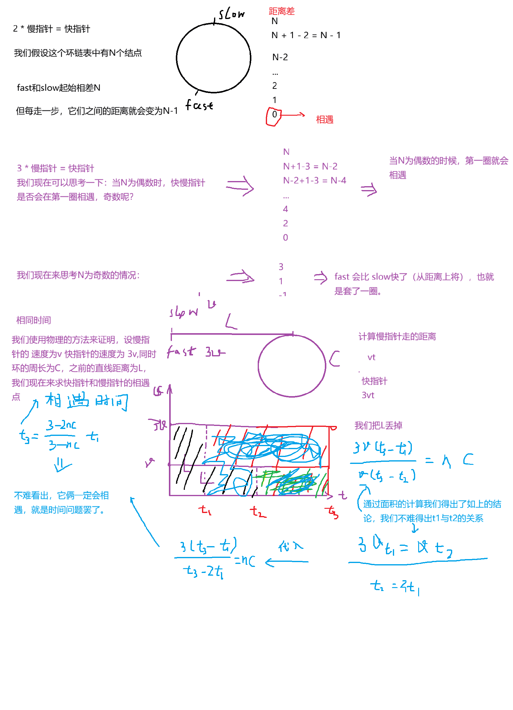 接下来我们来证明为什么快慢指针在换链表中一定会相遇,同时证明fast走三步可不可以。