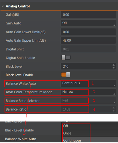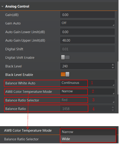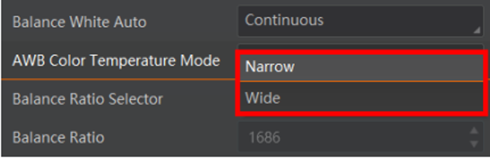- 将 AWB Color Temperature Mode 设置为 Narrow ,并选择 Balance White Auto 为 Once 。相机会自动调整白平衡,调整完成后会自动切换为 Off。