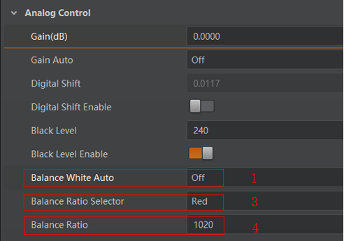 采集一张图像并获取其 RGB 分量,根据图像中的 RGB 值调整平衡比值。例如,若 Balance Ratio' 为1024,采集的图像 RGB 值分别为155、185、120,则可以按以下公式调整:
