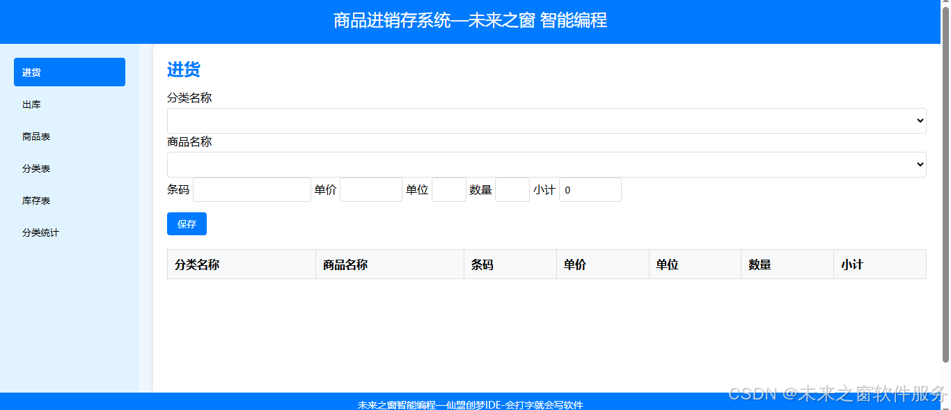 - 数据展示功能:下方的表格区域用于展示已录入并保存的进货商品明细,包含 "分类名称""商品名称""条码""单价""单位""数量""小计" 等信息,方便用户查看进货记录