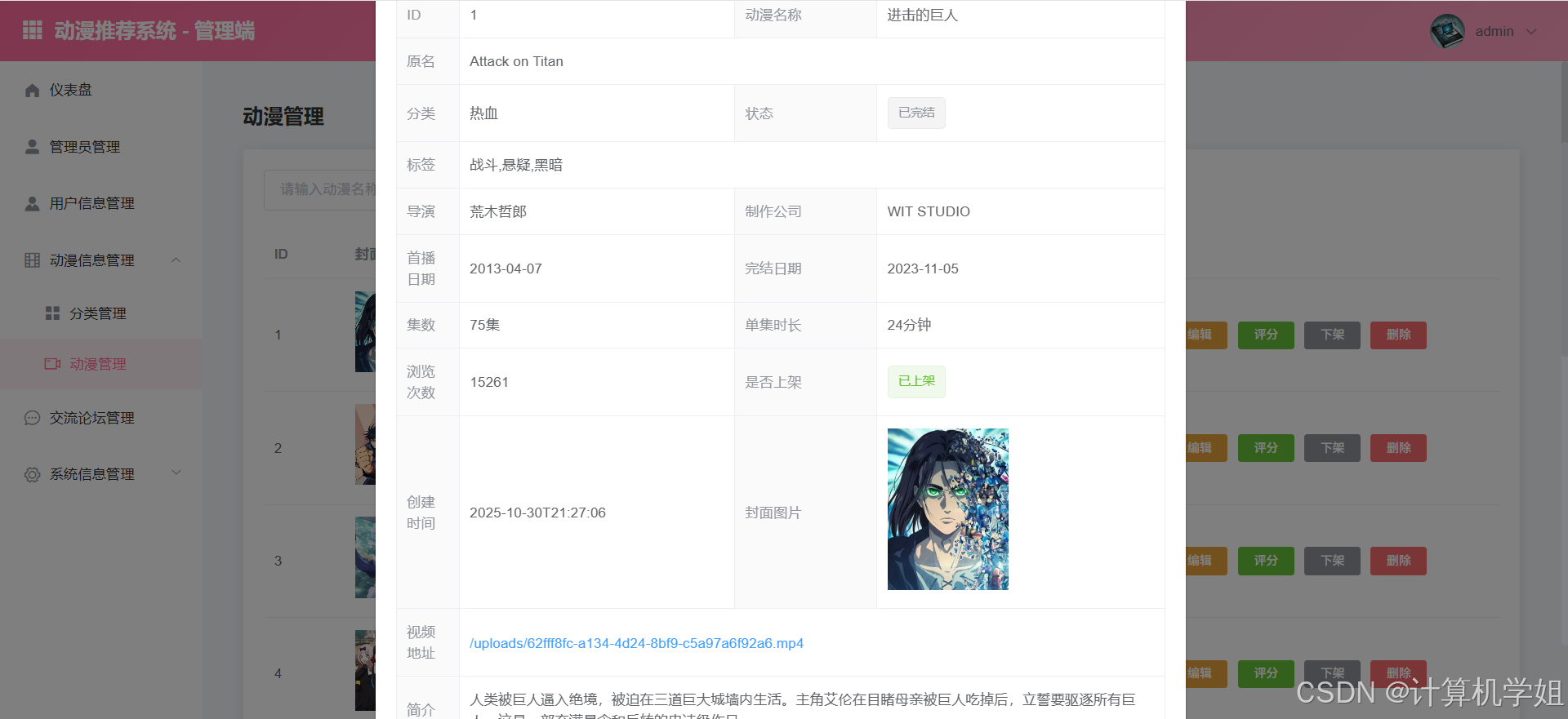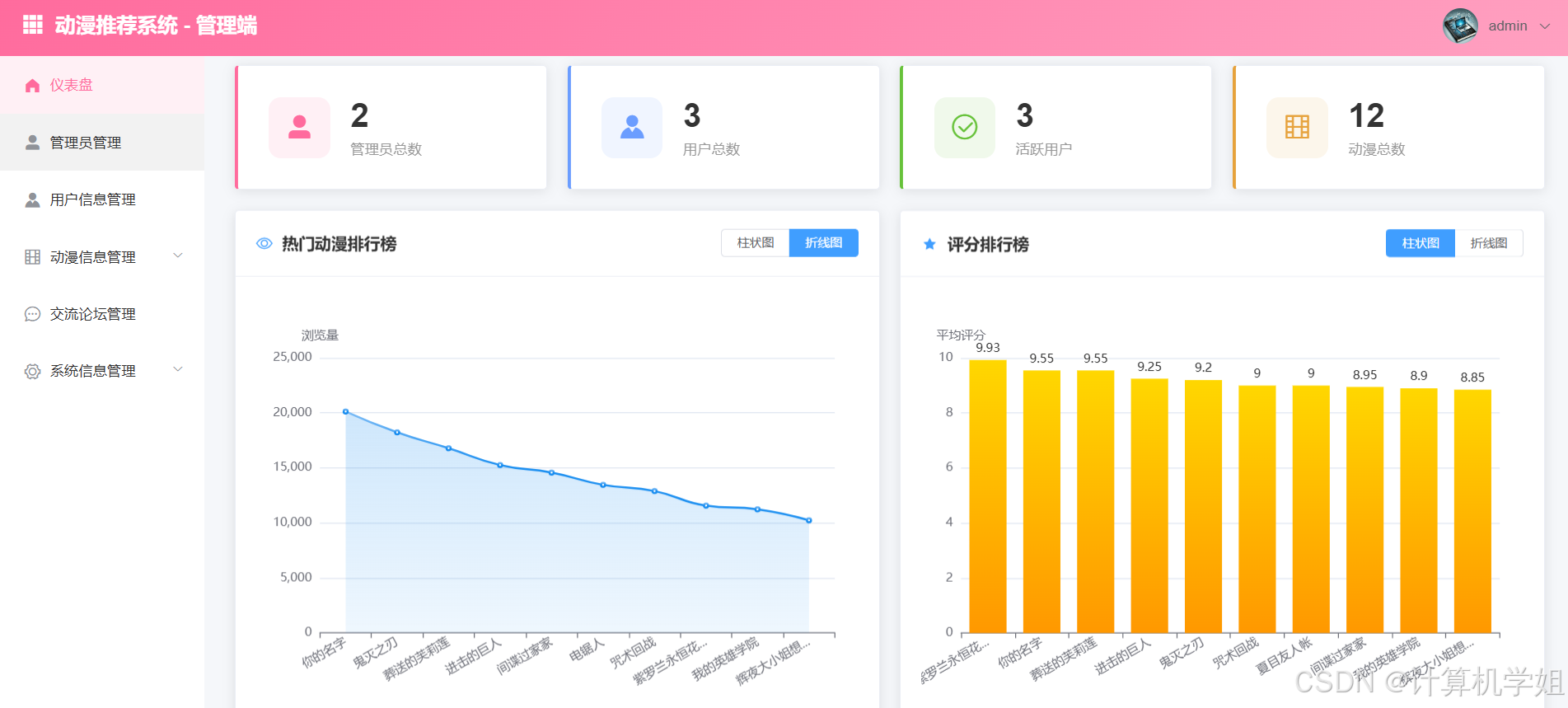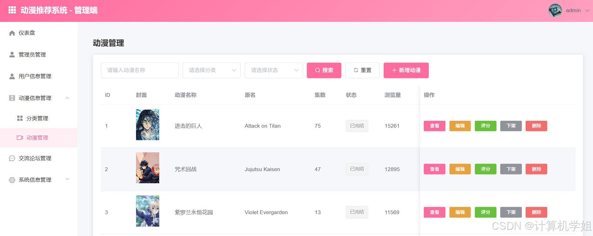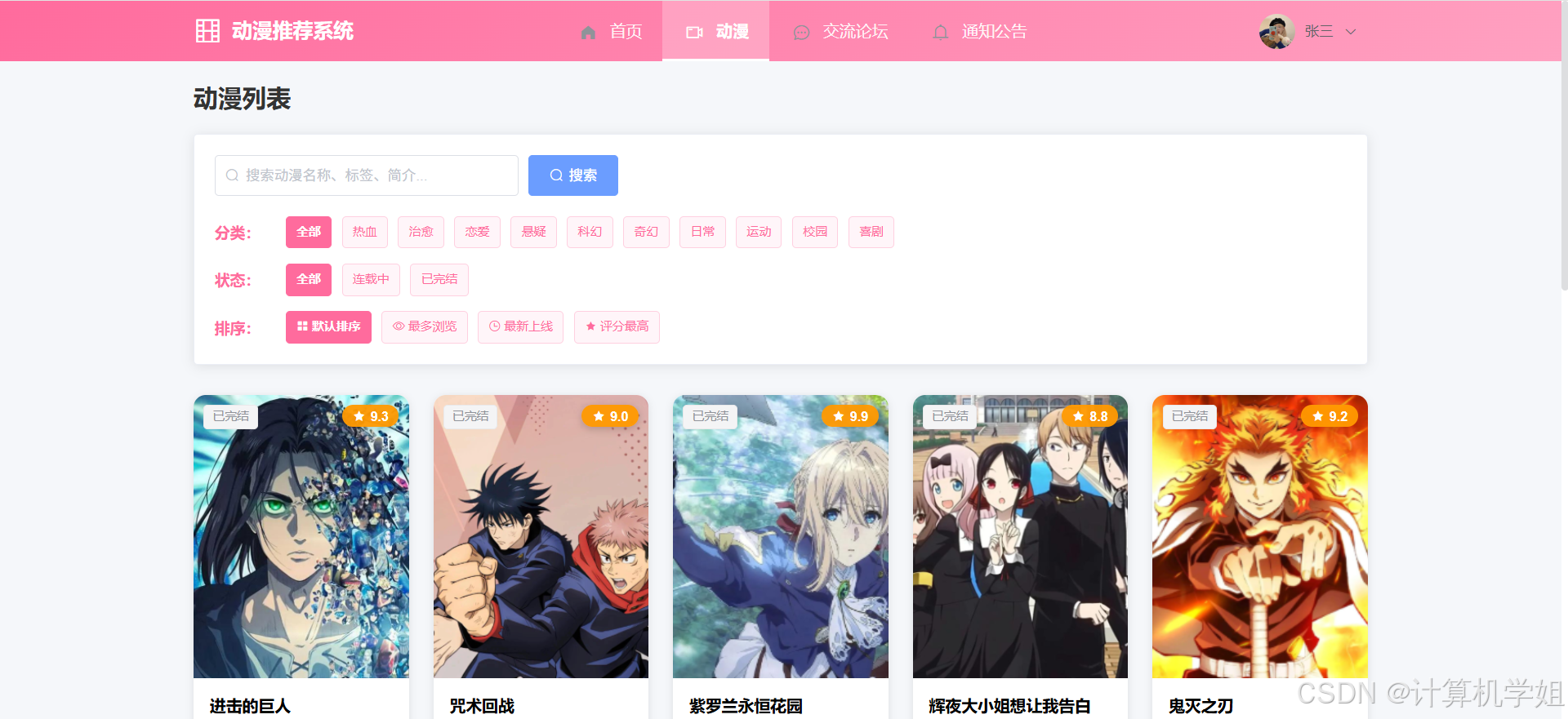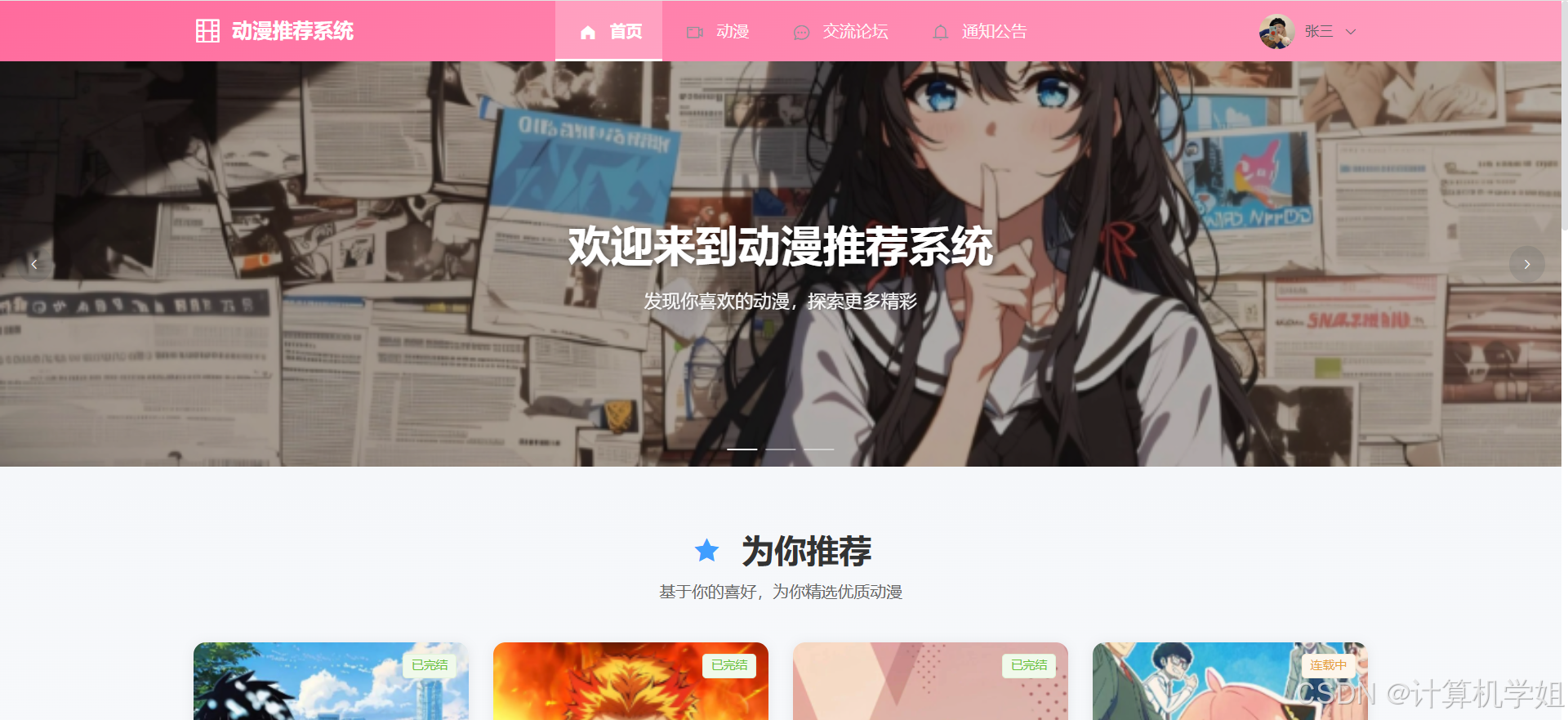 本研究基于SpringBoot+VUE+MySQL技术栈,成功开发了一个动漫推荐系统,实现了动漫资源整合与个性化推荐的核心功能。系统通过前后端分离架构,前端采用VUE框架构建动态交互界面,后端利用SpringBoot框架处理业务逻辑,MySQL数据库存储与管理数据,确保了系统的高效性与稳定性。推荐算法融合协同过滤与内容相似度,结合用户行为数据与动漫属性特征,生成精准推荐列表,有效解决了传统推荐方式同质化严重的问题。测试结果表明,系统在推荐准确率与用户满意度上表现优异,显著提升了用户发现优质动漫资源的效率。本研究不仅验证了技术融合在垂直领域推荐系统中的可行性,也为动漫行业提供了数据驱动的运营工具,促进了动漫产业的数字化转型。未来可进一步优化推荐算法,引入深度学习模型提升推荐精度,或扩展系统功能以支持更多用户场景,持续完善用户体验。