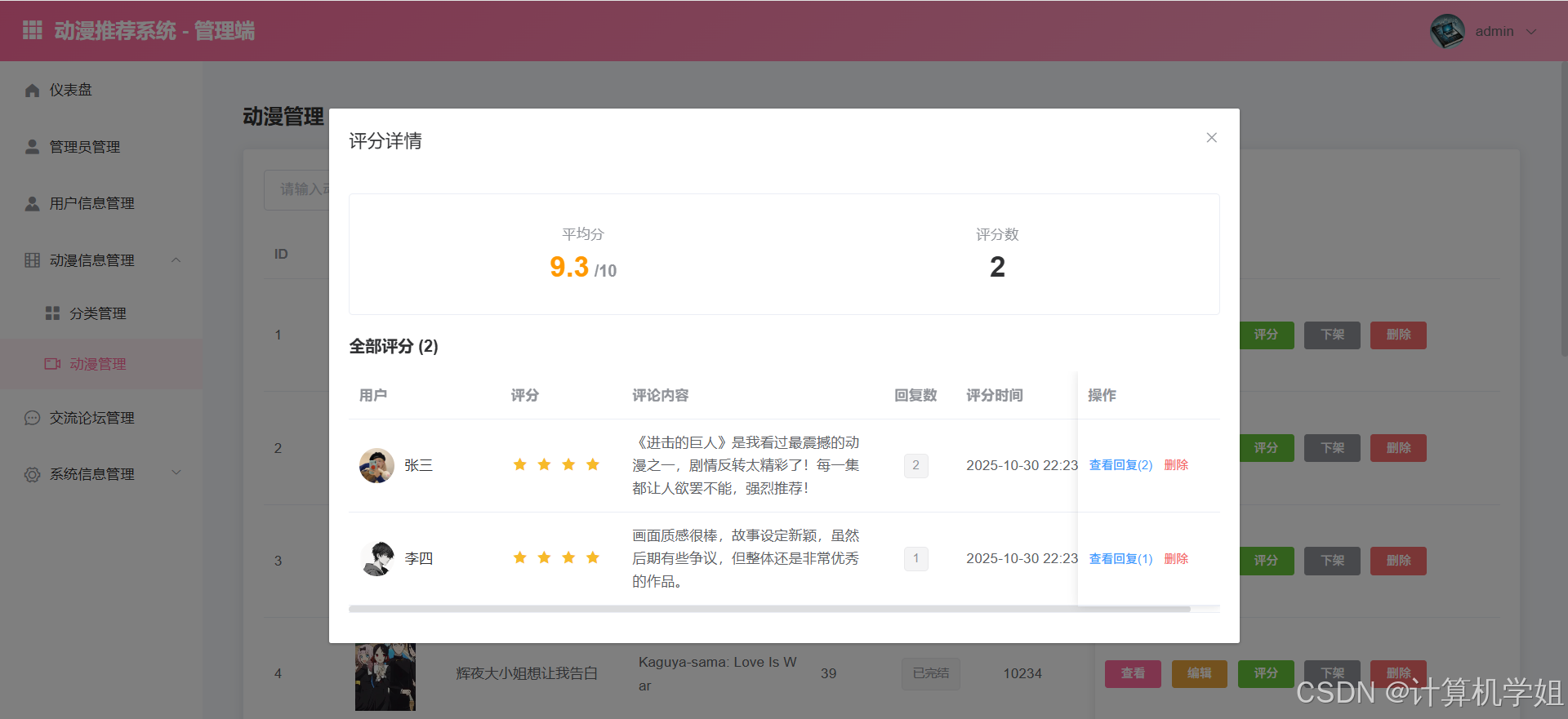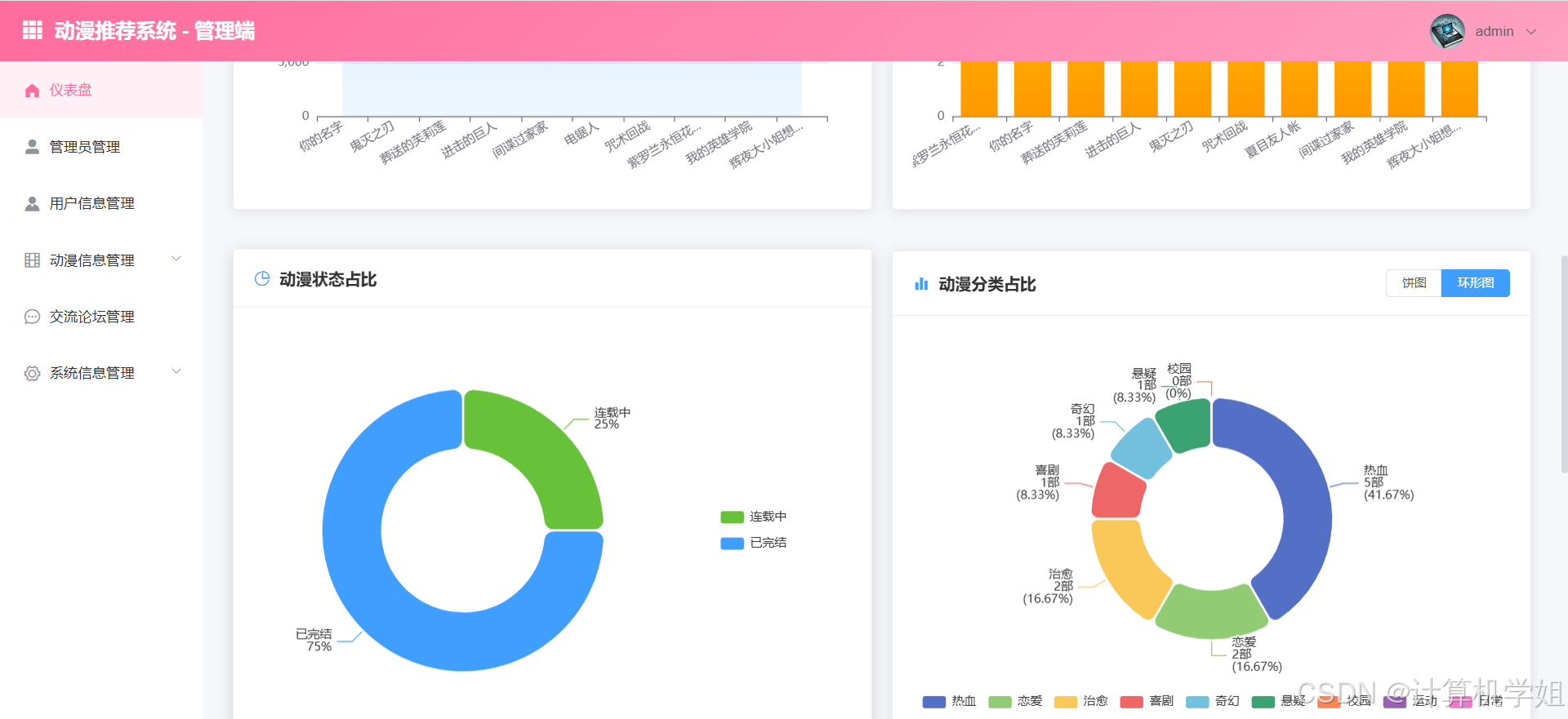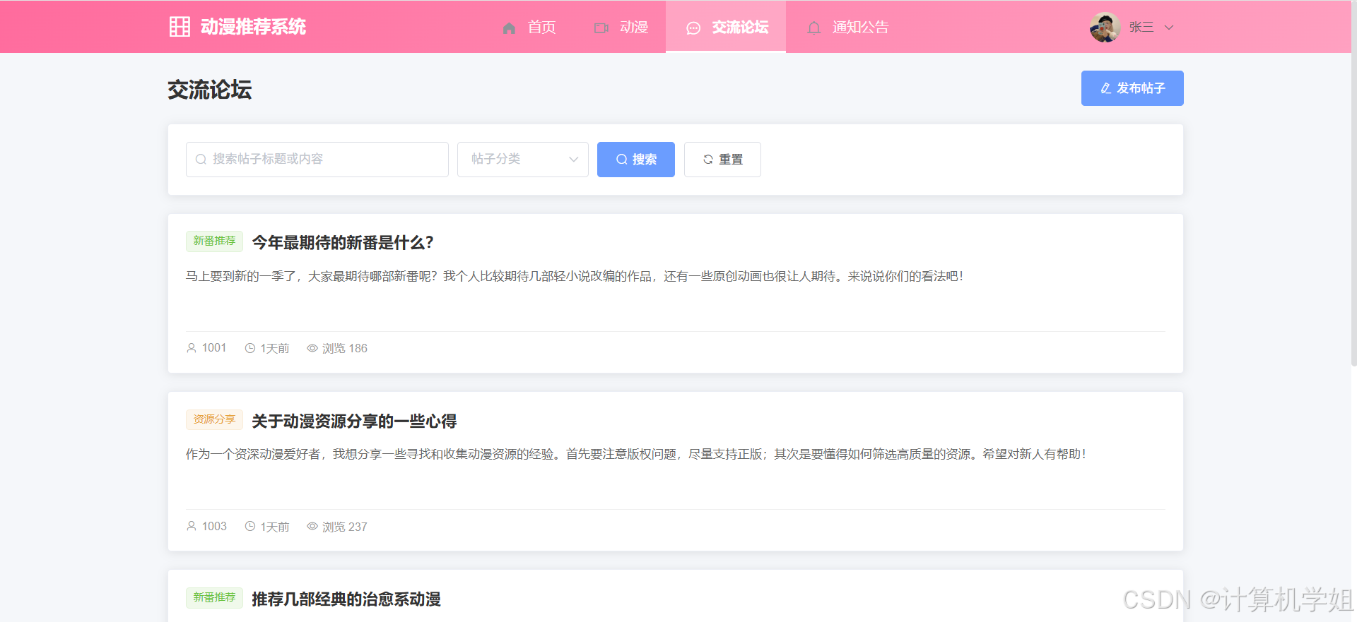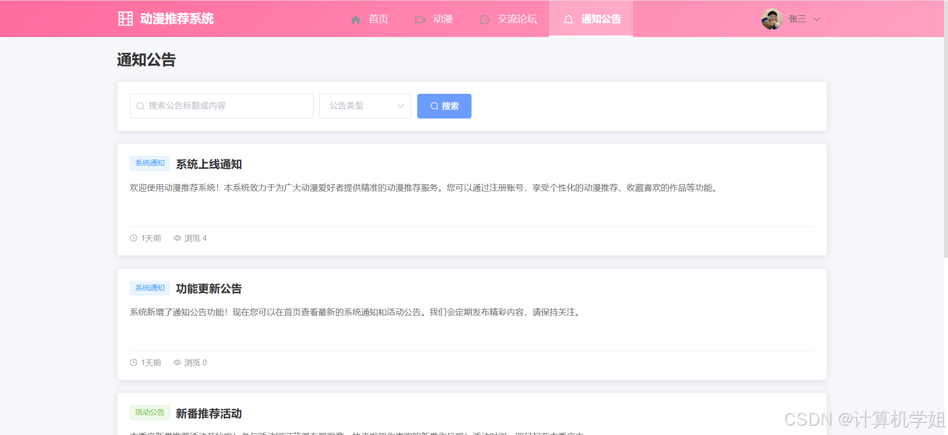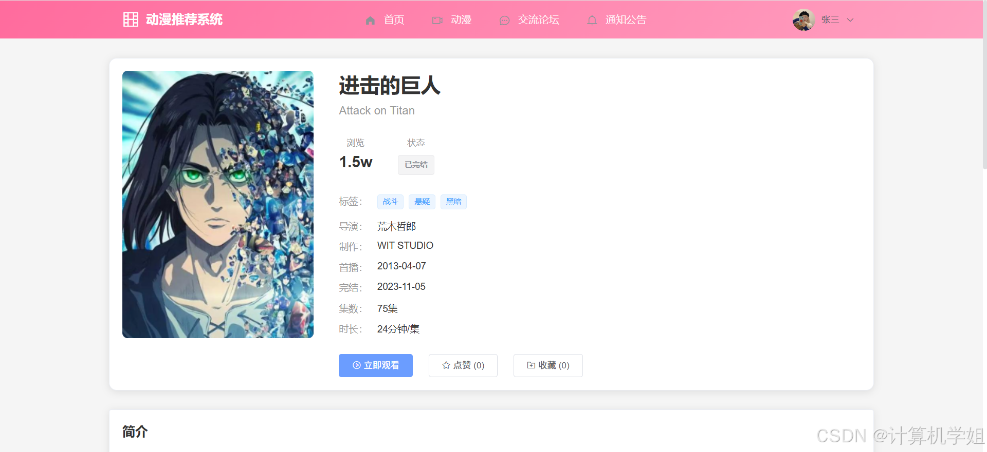 本研究基于SpringBoot+VUE+MySQL技术栈,成功开发了一个动漫推荐系统,实现了动漫资源整合与个性化推荐的核心功能。系统通过前后端分离架构,前端采用VUE框架构建动态交互界面,后端利用SpringBoot框架处理业务逻辑,MySQL数据库存储与管理数据,确保了系统的高效性与稳定性。推荐算法融合协同过滤与内容相似度,结合用户行为数据与动漫属性特征,生成精准推荐列表,有效解决了传统推荐方式同质化严重的问题。测试结果表明,系统在推荐准确率与用户满意度上表现优异,显著提升了用户发现优质动漫资源的效率。本研究不仅验证了技术融合在垂直领域推荐系统中的可行性,也为动漫行业提供了数据驱动的运营工具,促进了动漫产业的数字化转型。未来可进一步优化推荐算法,引入深度学习模型提升推荐精度,或扩展系统功能以支持更多用户场景,持续完善用户体验。