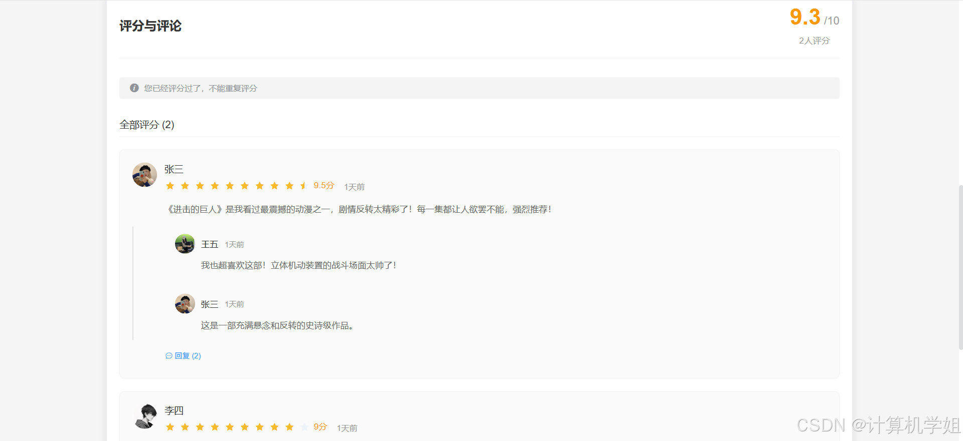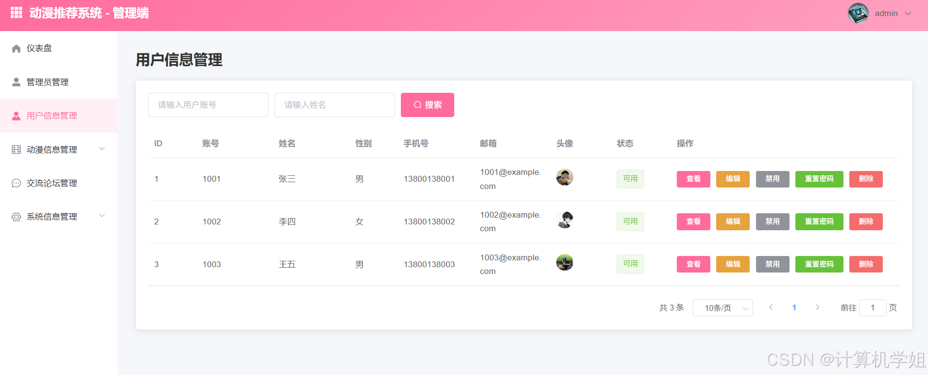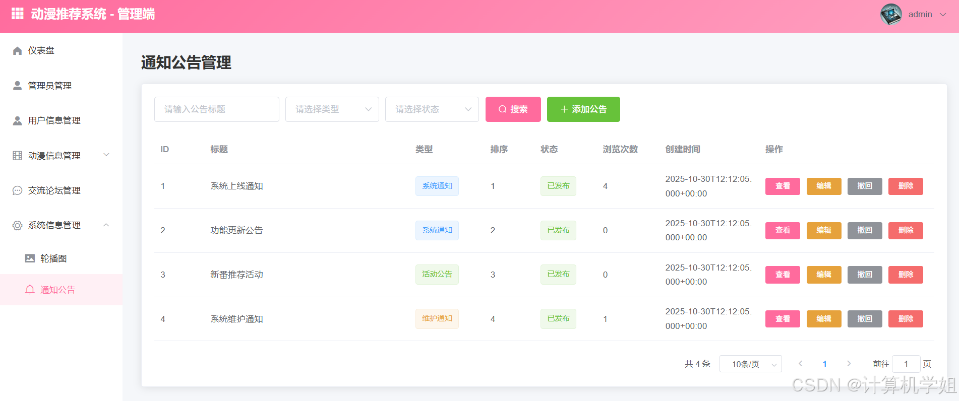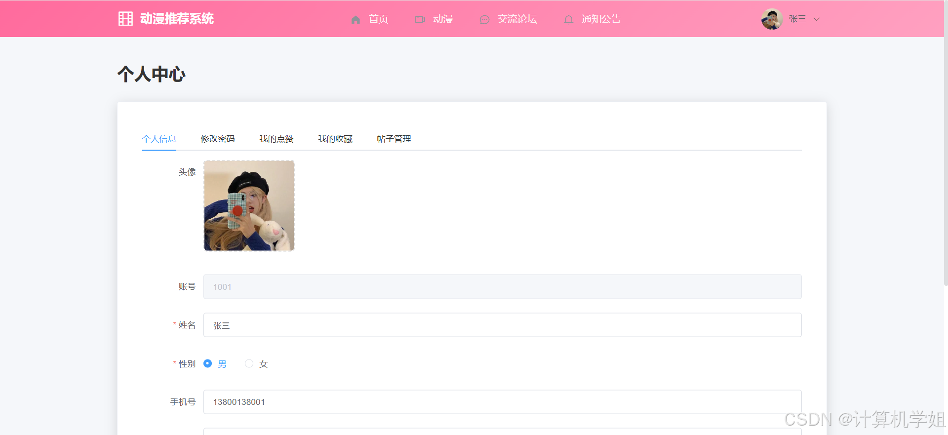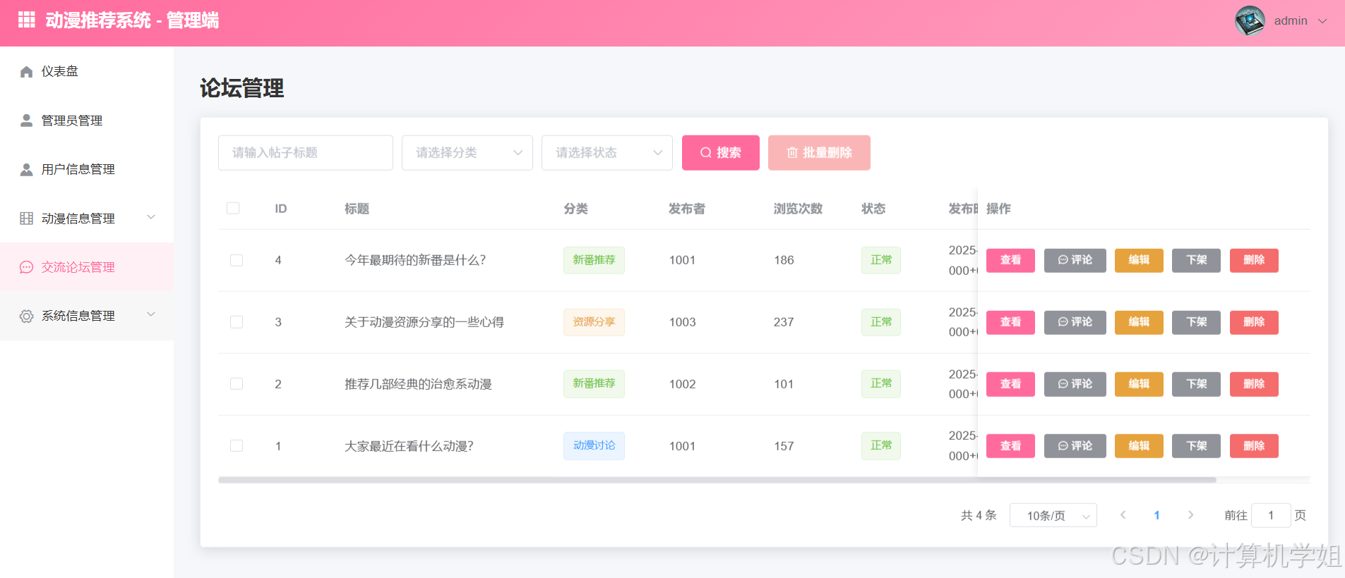 本研究基于SpringBoot+VUE+MySQL技术栈,成功开发了一个动漫推荐系统,实现了动漫资源整合与个性化推荐的核心功能。系统通过前后端分离架构,前端采用VUE框架构建动态交互界面,后端利用SpringBoot框架处理业务逻辑,MySQL数据库存储与管理数据,确保了系统的高效性与稳定性。推荐算法融合协同过滤与内容相似度,结合用户行为数据与动漫属性特征,生成精准推荐列表,有效解决了传统推荐方式同质化严重的问题。测试结果表明,系统在推荐准确率与用户满意度上表现优异,显著提升了用户发现优质动漫资源的效率。本研究不仅验证了技术融合在垂直领域推荐系统中的可行性,也为动漫行业提供了数据驱动的运营工具,促进了动漫产业的数字化转型。未来可进一步优化推荐算法,引入深度学习模型提升推荐精度,或扩展系统功能以支持更多用户场景,持续完善用户体验。