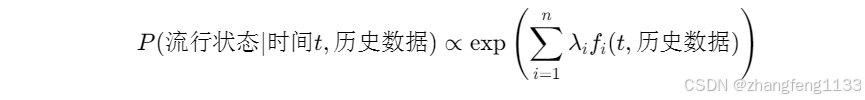 P(\\text{流行状态} \| \\text{时间}t, \\text{历史数据}) \\propto \\exp\\left(\\sum_{i=1}\^{n} \\lambda_i f_i(t, \\text{历史数据})\\right)