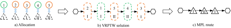 论文通过引入虚拟停车点,将客户分配与移动包裹柜路径决策解耦的求解策略。根据客户类型(自提、送货上门或灵活型)为其分配一个虚拟停车点,并确定相应的服务时间窗。随后,将这些虚拟停车点视为具有特定位置和时间窗的节点,将MPL路径规划问题转化为一个VRPTW进行求解。