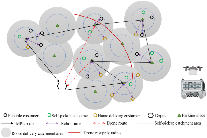 模型基于四个核心假设:每位客户仅接受一次服务;机器人单次服务一个客户但可重复部署;无人机单次仅向一个MPL补货;每个停车点在时间窗内至多被访问一次。通过定义路径规划、时间安排和载重分配等决策变量,构建了完整的约束体系,包括路径连续性约束、服务完整性约束、服务半径限制、资源调度序列约束、时空协调约束和运力平衡约束。
