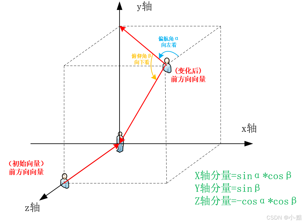 | 前方向向量 | 你眼睛看出去的 "视线方向"------ 比如你盯着墙上的钟,从你眼球(相机位置)到钟(目标点)的那根 "无形的线",就是前方向向量。 |