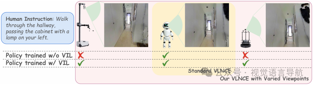 VLNCE任务的重要性:VLNCE(Vision-Language Navigation in Continuous Environments)是一个关键的具身AI研究问题,要求智能体能够根据人类指令自由移动以到达目的地。然而,大多数导航策略对视角变化较为敏感,即使较小的相机高度和视角角度的变化也可能导致性能大幅下降,这限制了这些策略在真实世界中的应用。