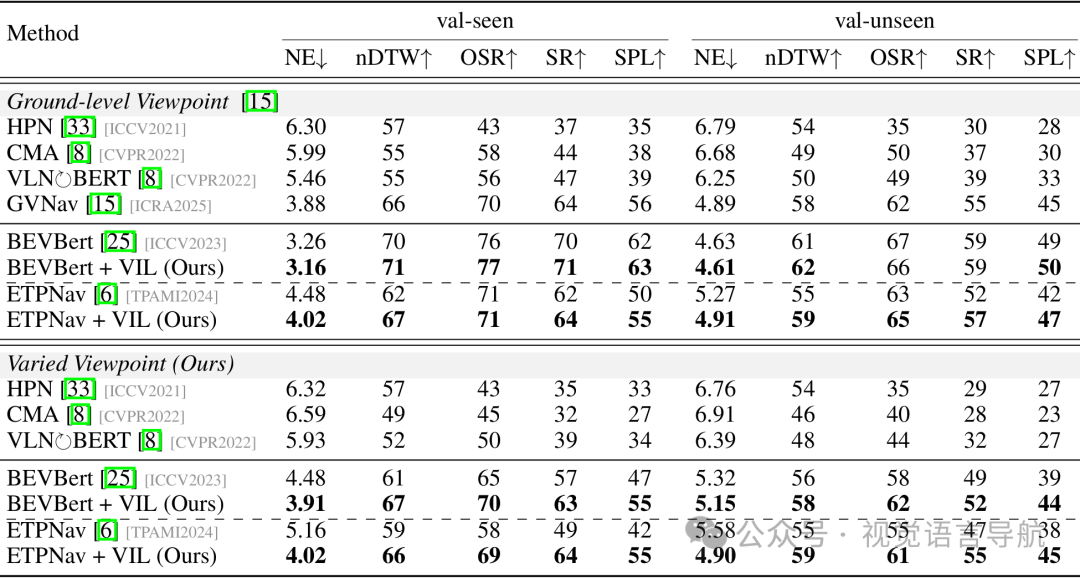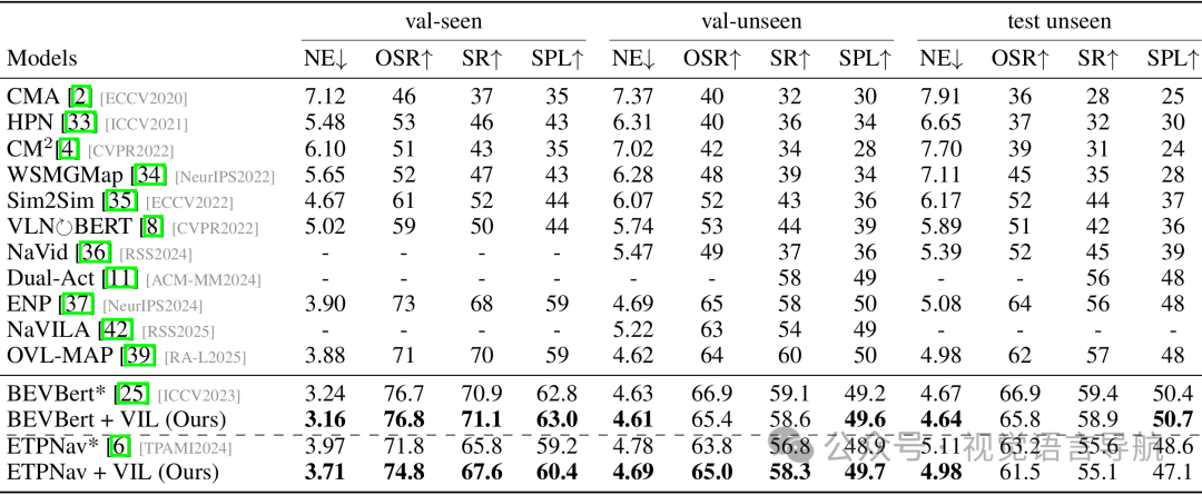 基线方法:同样将VIL应用于BEVBert和ETPNav。