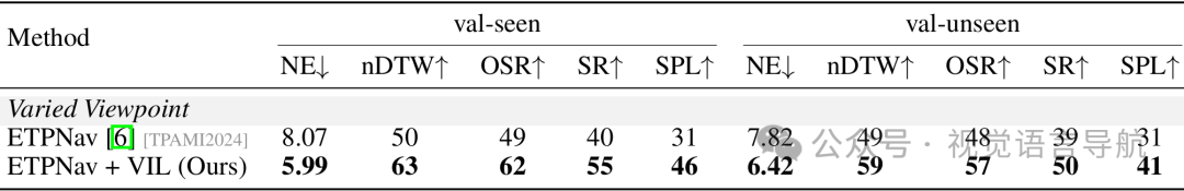 RxR-CE数据集:VIL同样表现出色。ETPNav + VIL相比于ETPNav在val-seen和val-unseen上分别将nDTW提高了10%-13%,OSR提高了9%-13%,SR提高了11%-15%,SPL提高了10%-13%。