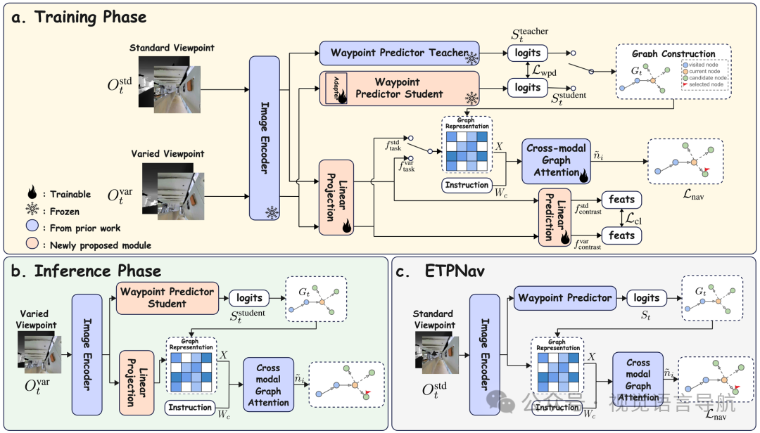 教师和学生模型的初始化:教师模型和学生模型共享相同的航点预测器架构,均初始化为ETPNav中使用的模型。教师模型固定,处理标准视角观测,而学生模型处理变化视角观测。