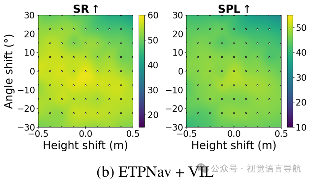 ETPNav + VIL:性能热图更加平滑,性能在不同视角配置下更加均匀,标准差显著降低。例如,SPL的标准差降低到3.59,SR的标准差降低到3.66。