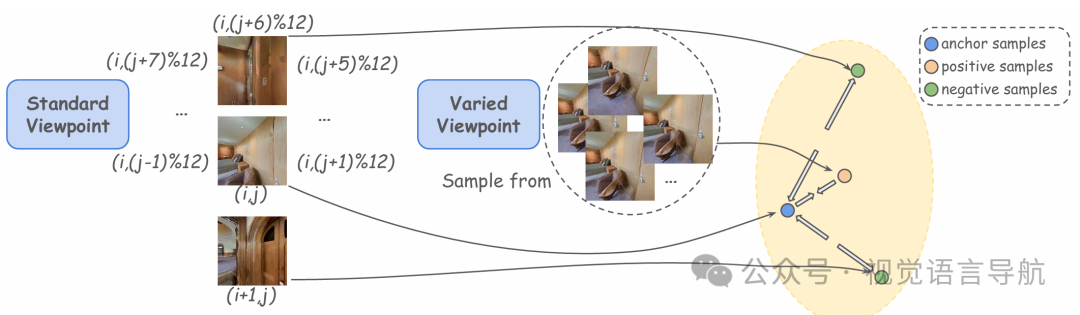 构建图表示和对比学习样本:为了与预训练的ETPNav模型兼容,初始化第一层线性层为单位矩阵,保留原始特征分布。在对比学习中,将标准视图和变化视图的特征分别记为和,并构建正样本和负样本对。对于训练批次中的每个实例,定义正样本对为同一朝向下标准视图和变化视图的特征,负样本对则通过选择相反朝向的特征或不同场景中相同朝向的特征来构建。