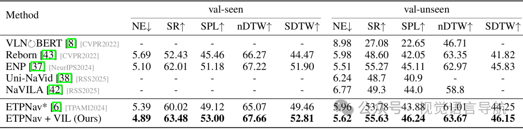 R2R-CE数据集:VIL不仅没有降低性能,还略有提升。例如,BEVBert + VIL相比于BEVBert在val-unseen上的SPL从49.2提高到49.6。ETPNav + VIL相比于ETPNav在val-unseen上的SR从56.8提高到58.3,SPL从48.9提高到49.7。