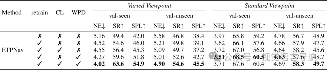 仅使用航点预测器蒸馏(WPD):在变化视角设置下,性能显著提升。例如,在val-unseen上,SPL从37.2%提升到45.5%。在标准视角设置下,性能也有所提升。