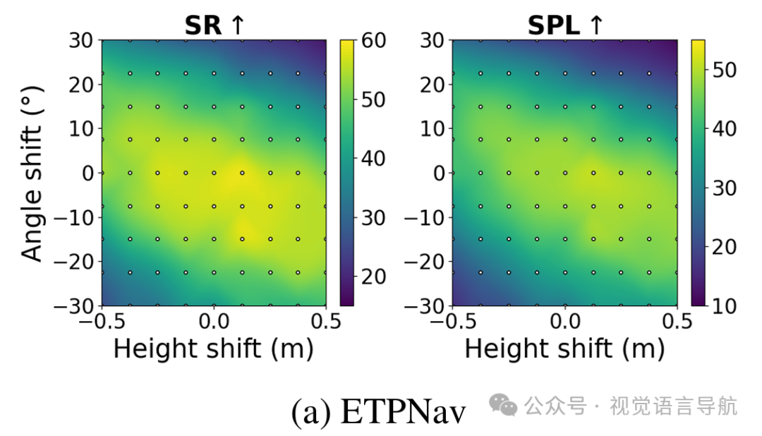 实验设置:在R2R-CE数据集的val-unseen集上,评估每个模型在81种不同的视角配置下的性能。每种配置由一个高度-角度对定义,从和的均匀网格中采样。
