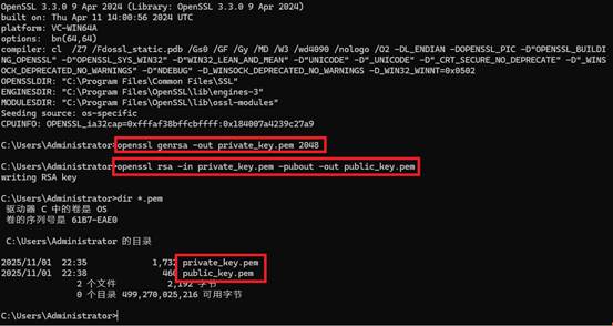首先需要安装Win64OpenSSL_Light-3_3_0.exe程序,然后通过其命令行工具执行"openssl genrsa -out private_key.pem 2048"生成私钥,再执行"openssl rsa -in private_key.pem -pubout -out public_key.pem"导出公钥。生成的文件默认保存在C:\Users\Administrator目录下。这种方法简单易行,适用于需要配置密钥对的开发场景。