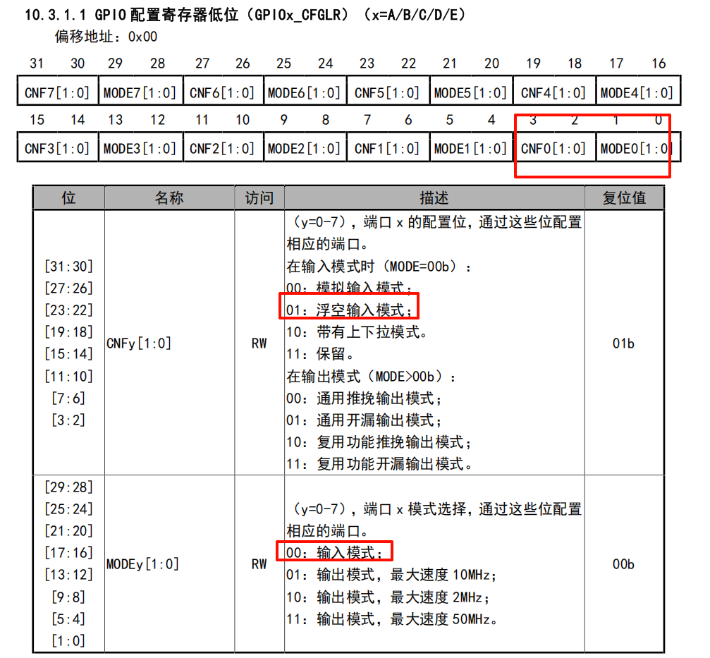MODE0 位为 0-1位 bit值分别为 00