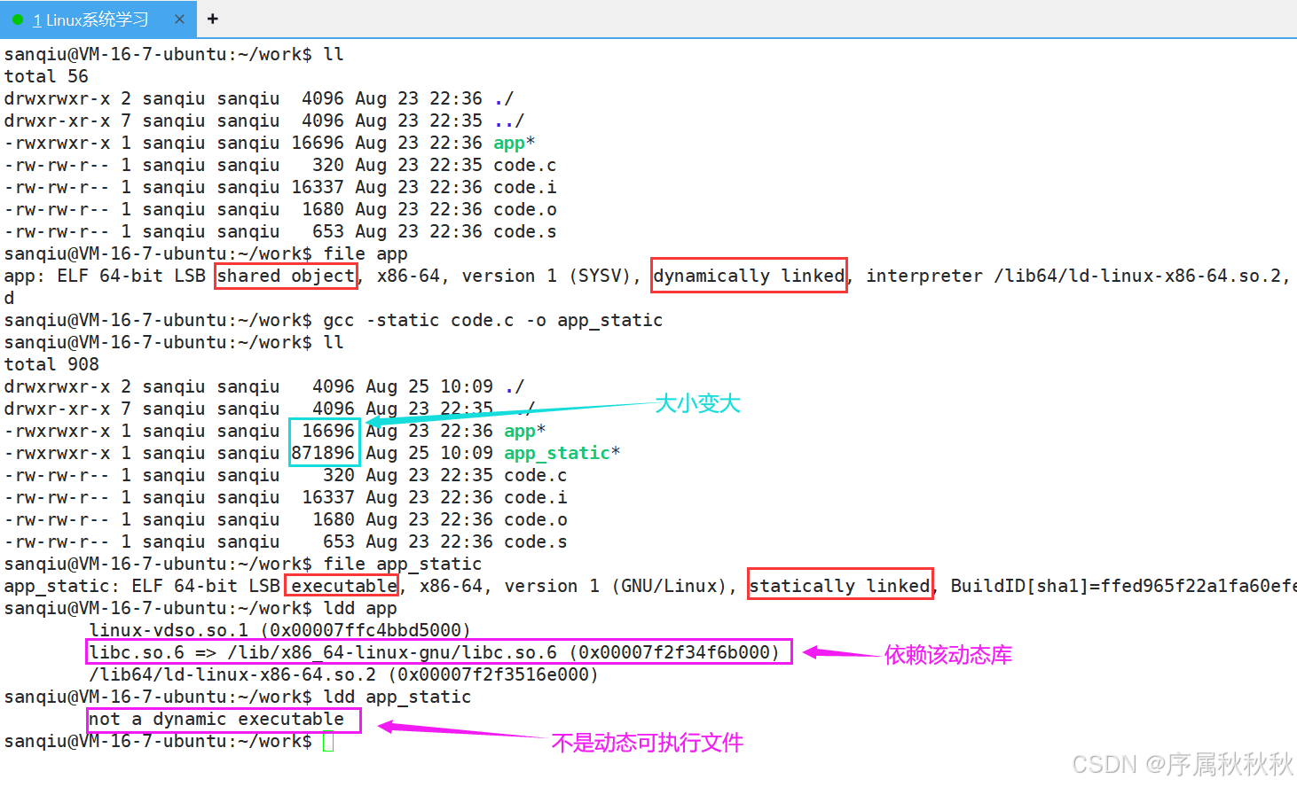 - 之后链接器会扫描程序中引用的函数 和变量,从对应的静态库中找到这些符号的定义,并把相关代码段复制到可执行文件中