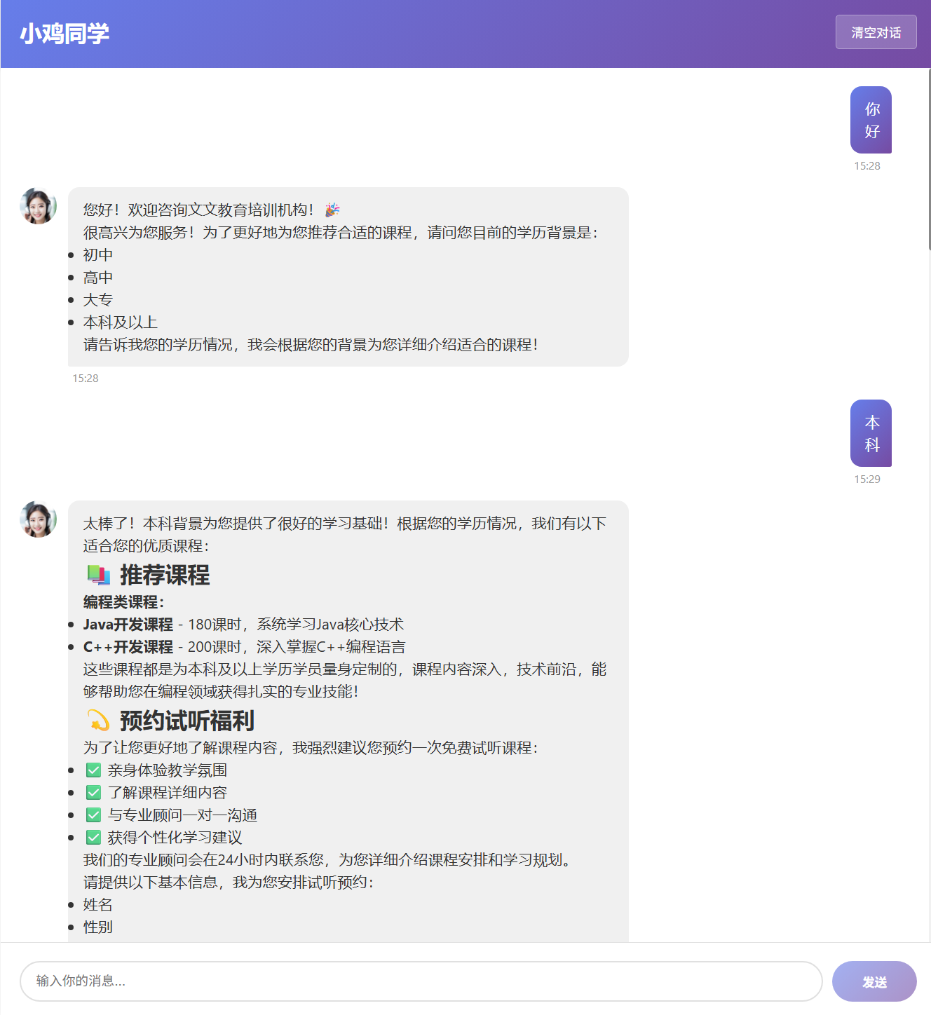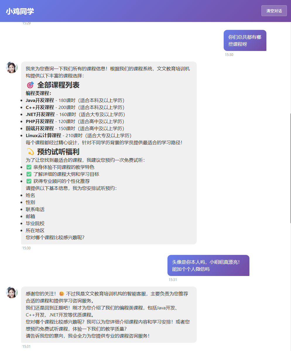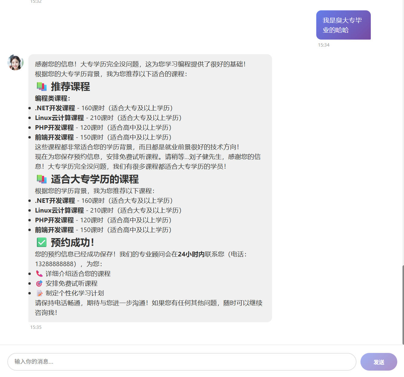 - 当用户询问价格时,统一回复:"课程价格需要根据您的具体情况定制,我们的顾问会为您详细说明"