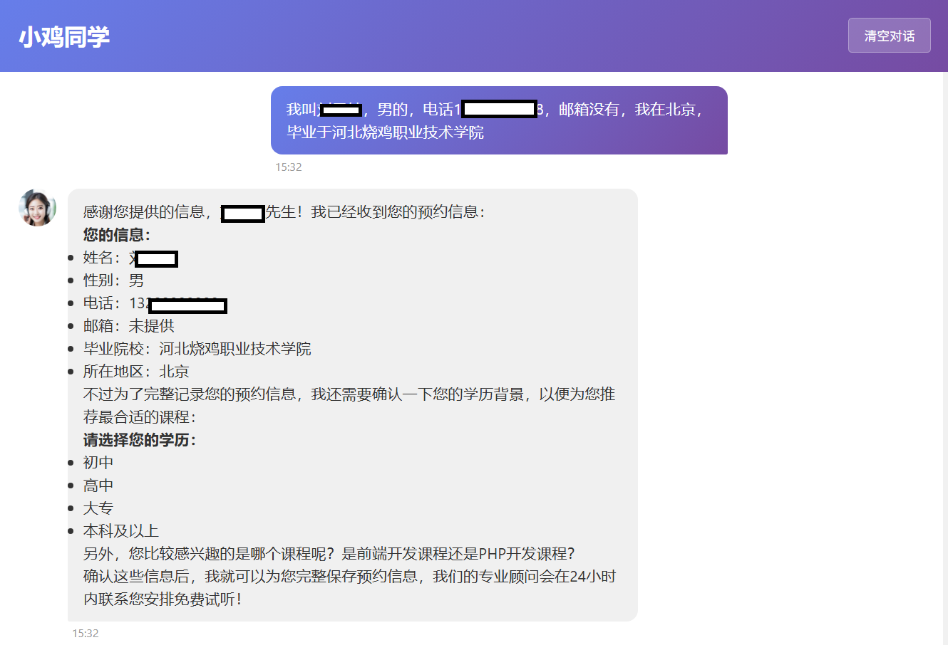 这个需求就不是纯Prompt对话模式就能实现的,因为大模型不知道培训学校有啥课程,更没法往数据库保存数据,此时,需要通过Function calling(Tools)完成,将大模型设置为培训机构的AI客服,传统应用接口实现获取课程列表和保存学员信息的Function,大模型通过Function calling就能代替真人对咨询者提出课程建议,并进一步询问出咨询者的报班意向和联系方式信息记录在数据库中。