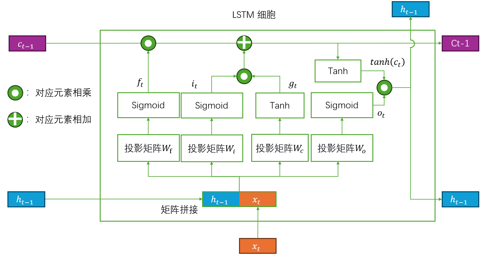 每个LSTM层都由若干个LSTM细胞(LSTM Cell)组成,其结构如下所示: