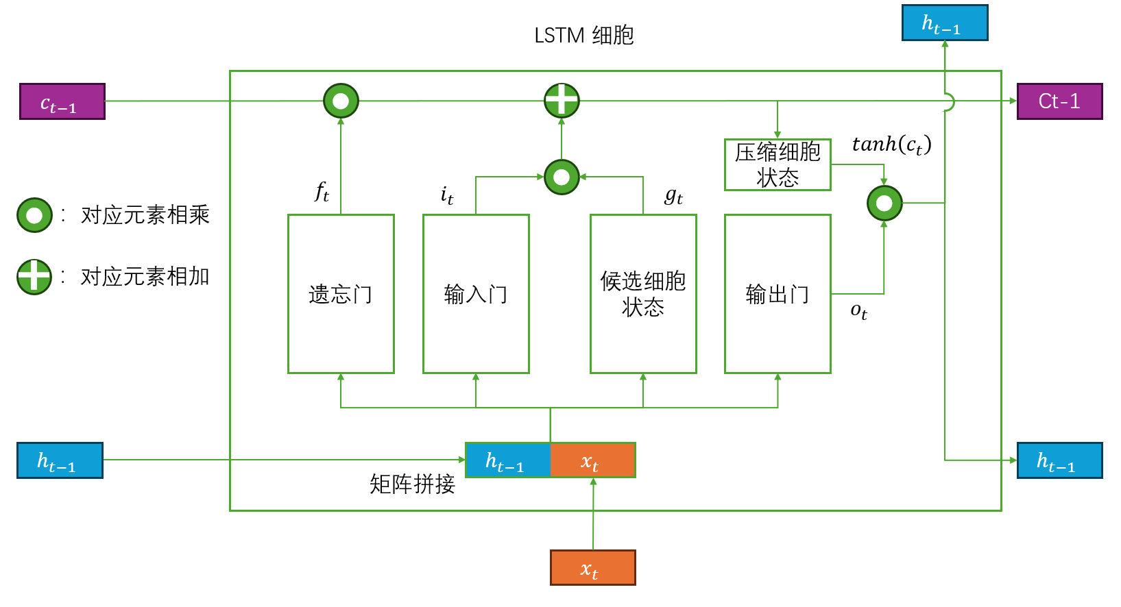 - LSTM细胞:包含3个门控 + 2个状态的核心计算单元