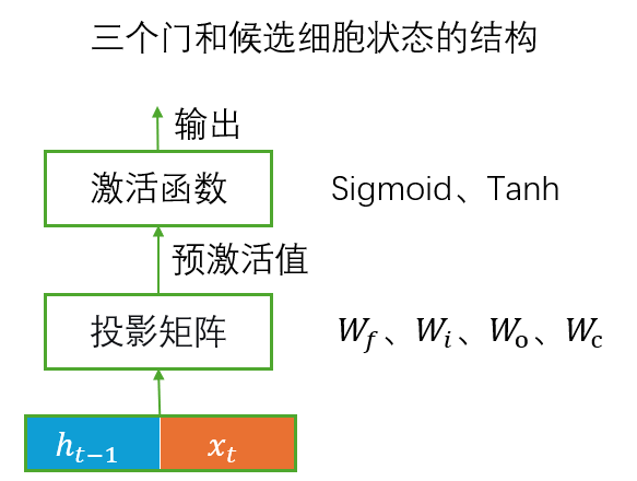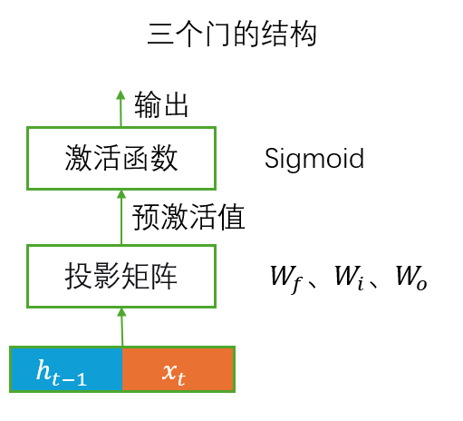 其输入通过各自对应的投影矩阵(,角标对应其英文名开头)投影变成预激活值,再通过激活函数Sigmoid变为最终的输出(门控信号)。