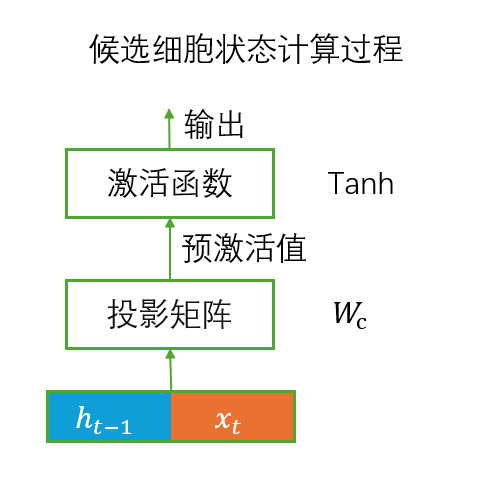 其计算方式为:将输入通过自己对应的投影矩阵(,角标对应其英文名开头)投影变成预激活值,再通过激活函数Tanh变为最终的输出(细胞状态)。