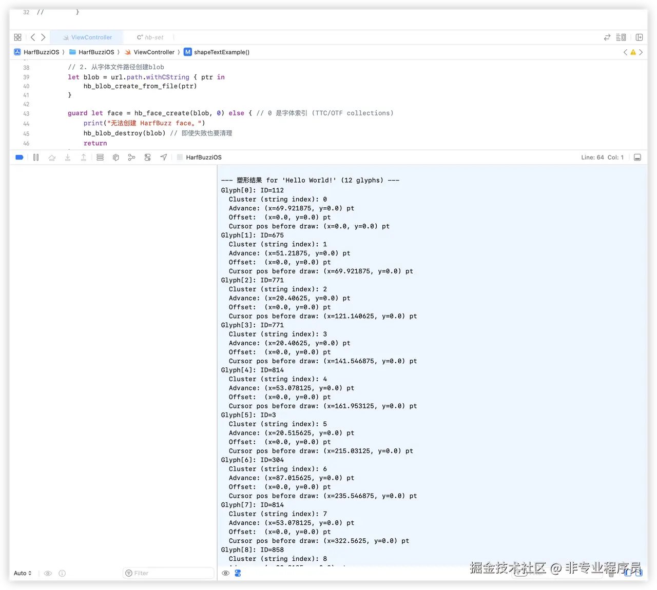 下面我们以 Swift 中调用 HarfBuzz 塑形一段文本为例: