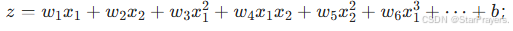 - 模型的线性组合包含特征的平方项:z=x12+x22−1(即 w1=1,w2=1,b=−1,这里的 "线性组合" 是对 "非线性特征(x12,x22)" 的线性加权);