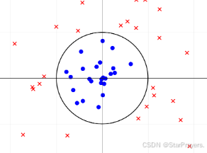 - 圆外的样本(红叉)满足 x12+x22>1,即 z>0,模型预测 y=1。