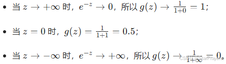 - 当z=−100时,g(z)≈0。